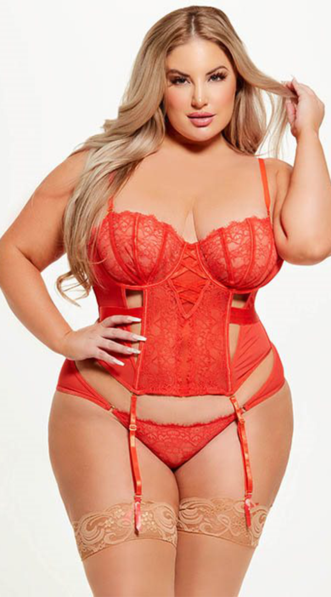 Heat up your evenings in this sexy plus size bustier set featuring lace underwire cups with piping details, adjustable spaghetti straps, a lace and mesh bodice with cut-out panels, a thick waistband, a hook and eye back closure, removeable adjustable garter straps, and a matching panty with a strappy open back. (Thigh high stockings not included.)