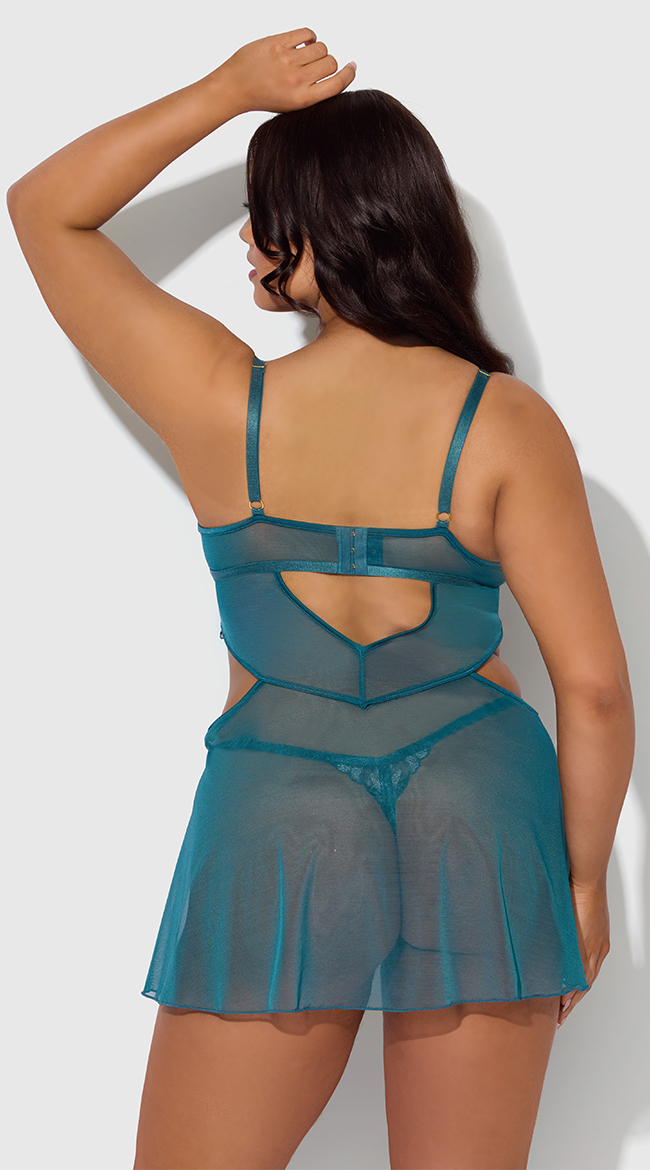 Tempt and tease in this flirty babydoll set featuring sheer underwire cups with floral embroidery, adjustable spaghetti straps, a front keyhole opening, a sheer mesh and floral embroidered underbust, a hook and eye back closure, cut-out sides, a back keyhole opening, a sheer mesh skirt, and a matching thong with an adjustable waistband. Embroidered panels glow under a black light!