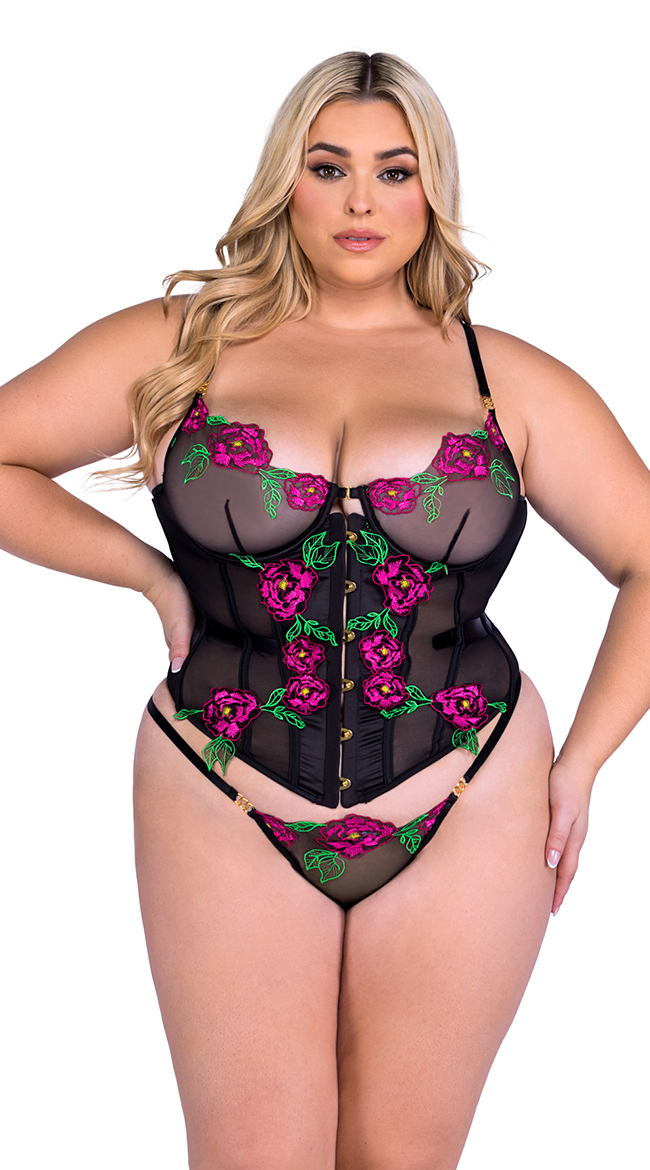 Accentuate your curves in this sexy plus size black corset set featuring sheer mesh underwire cups with pink and green floral embroidery, adjustable spaghetti straps with gold hardware, a sheer bodice with built-in boning, allover floral embroidery, hook and eye front closures, a lace-up back closure, and a matching thong with an embroidered back.