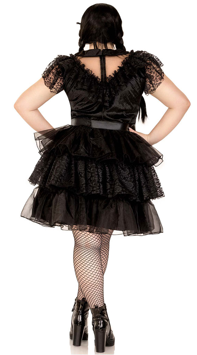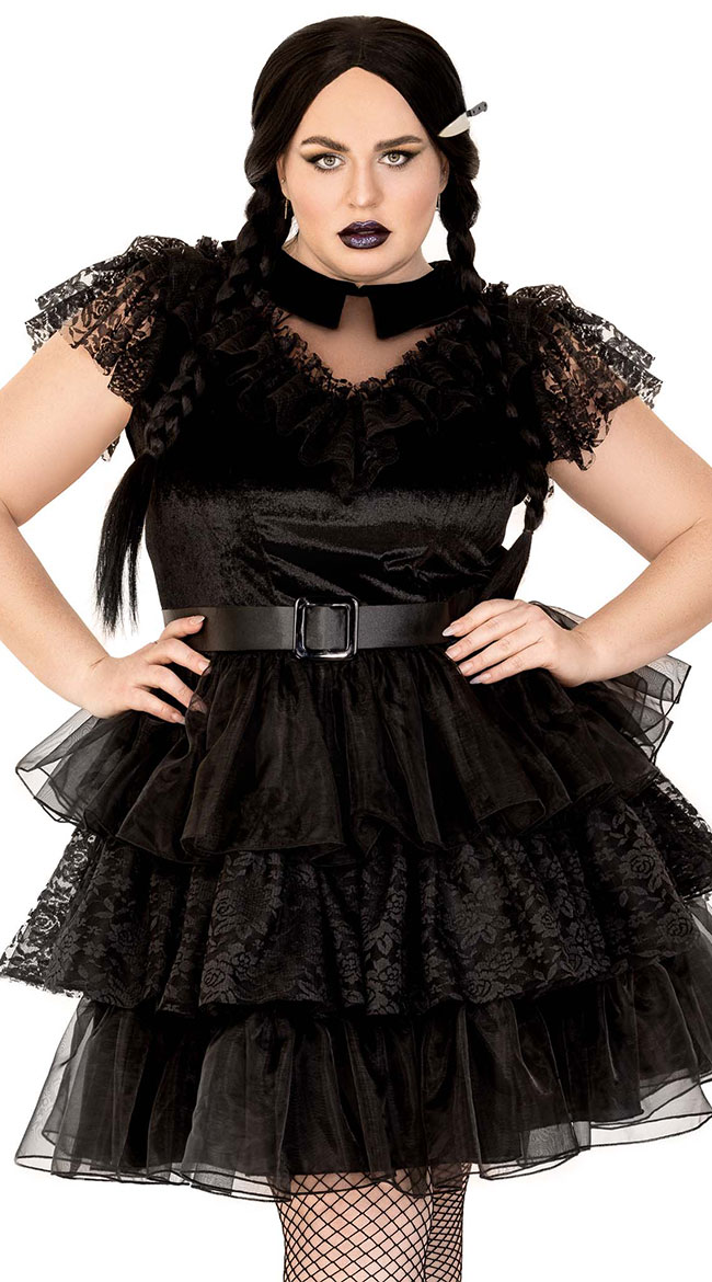 Get ready to dance with your hands above your head in this plus size Raving Rebel costume featuring a velvet mini dress with a high mesh neckline, a ruffled lace neck trim, lace cap sleeves, a back zipper closure, a tiered skirt, a matching belt, and a knife hair clip. (Wig and pantyhose not included.)