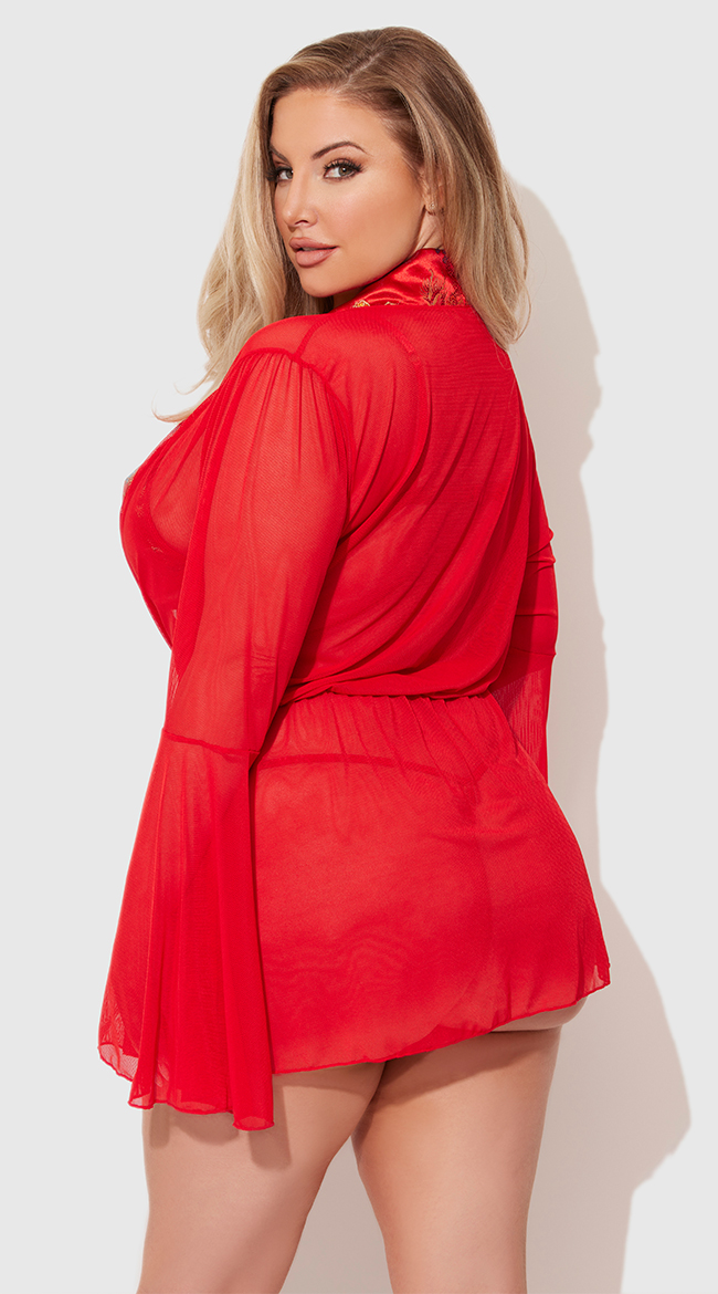 Look and feel as divine as the red dragon in this gorgeous plus size bra set featuring embroidered triangle cups, adjustable spaghetti straps, a hook and eye back closure, a matching low rise thong, and a matching mesh robe with an embroidered collar, long bell sleeves, and a front hook closure with a swirling applique detail.