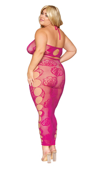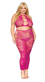 Leave your lover speechless in this sexy plus size bralette set featuring a high neckline with halter straps, a sheer fishnet bust with floral lace embroidery, circular cut-outs, and a matching maxi skirt with a high waist. (Panty not included.)