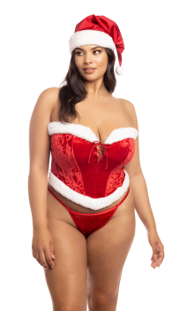 Step into holiday glamour with a sultry twist in this plus-size Santa’s Entourage bustier set crafted to turn up the heat on even the chilliest nights. Plush red velvet meets seductive lace-trimmed accents and a deep V-neckline framed with white fuzzy trim for festive flair that feels luxurious and bold. Built-in boning sculpts your silhouette while adjustable lace-up detail lets you tailor your fit just right. A matching cheeky thong completes the set for a look that’s both playful and provocatively chic — perfect for after-dark festivities, gifting moments, or a night on the naughty list. Hat not included — but confidence sure is.