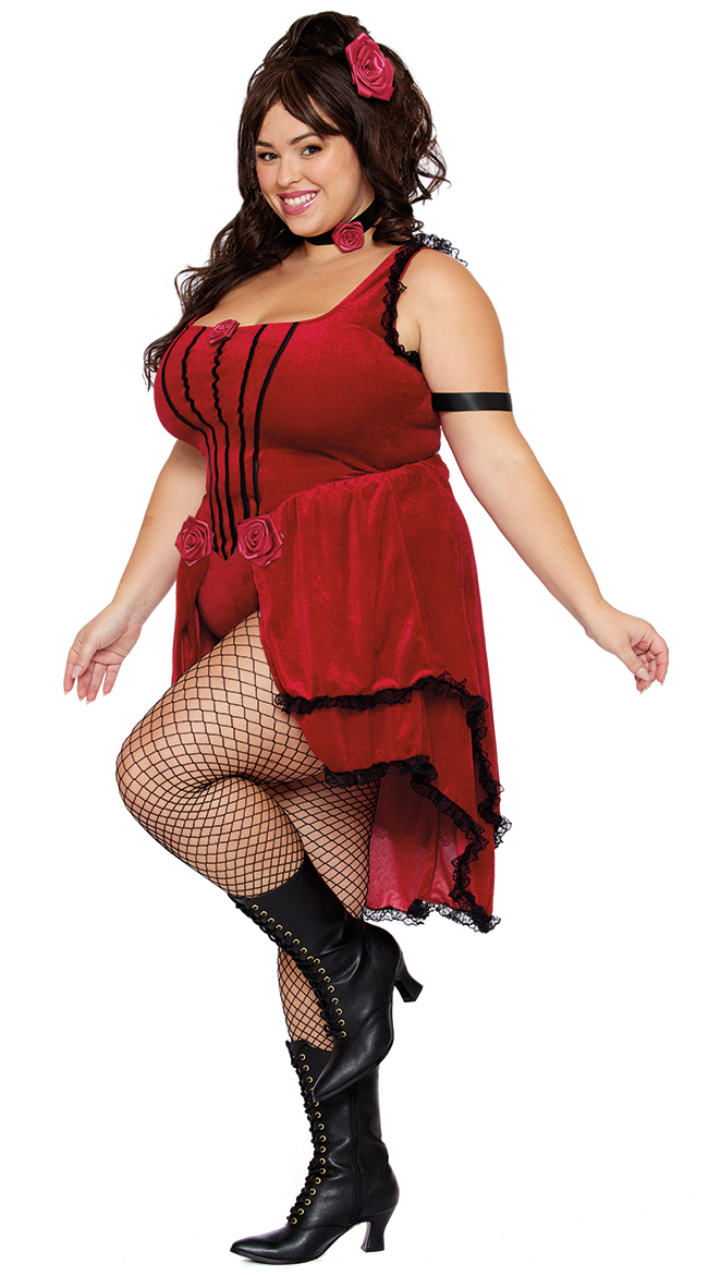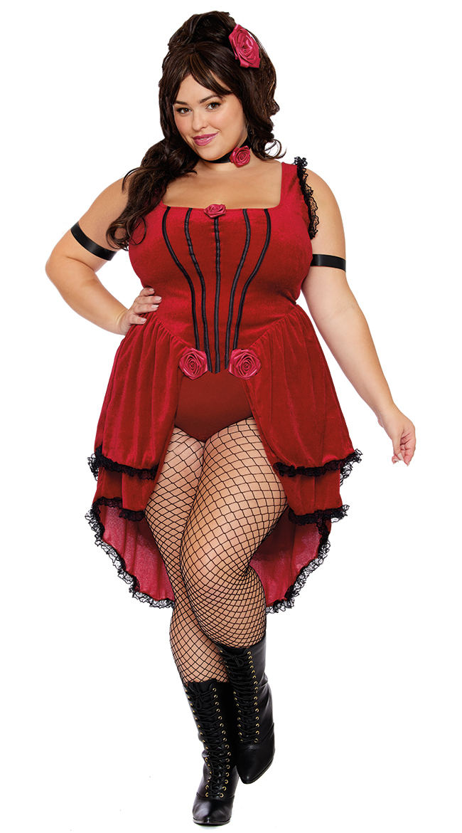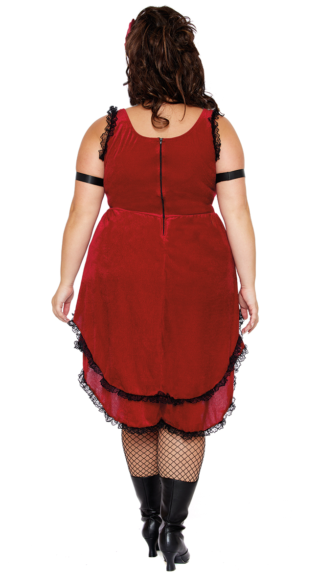 Turn heads at the saloon in this plus size Scarlet Lady Costume featuring a red velvet top with a straight neckline, thick shoulder straps with a black lace trim, rose appliques, black bodice piping, a back zipper closure, an attached split skirt with a tiered design and a black lace trim, a matching booty short with a cheeky cut back, black armbands, a black choker with a rose applique, and a rose hair clip. (Fishnets not included.)