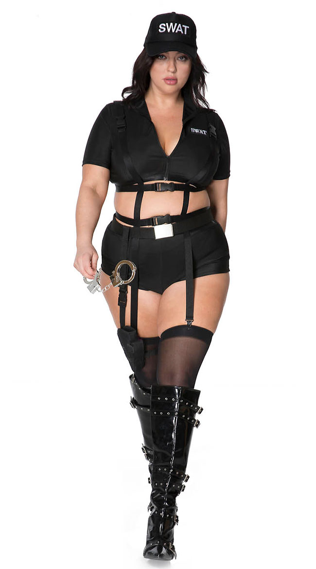Dare to do the dangerous jobs in this plus size SWAT Commander costume featuring a black crop top with a front zipper closure, short sleeves, "SWAT" patches, matching booty shorts with a cheeky cut back, a body harness with front buckle closures and garter straps, a black belt with silver buckle, a belt holster, a matching SWAT hat, and silver toy handcuffs. (Thigh high stockings not included.)