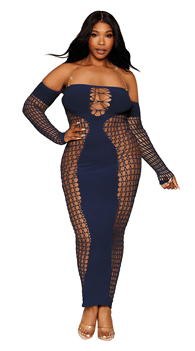 Highlight your seductive curves in this sultry plus size Lingerie gown featuring a straight neckline, chain halter straps, off-the-shoulder net sleeves with thumb loops and opaque tops, an opaque bodice with a wide net panel, and a form-fitting opaque skirt with fishnet sides.