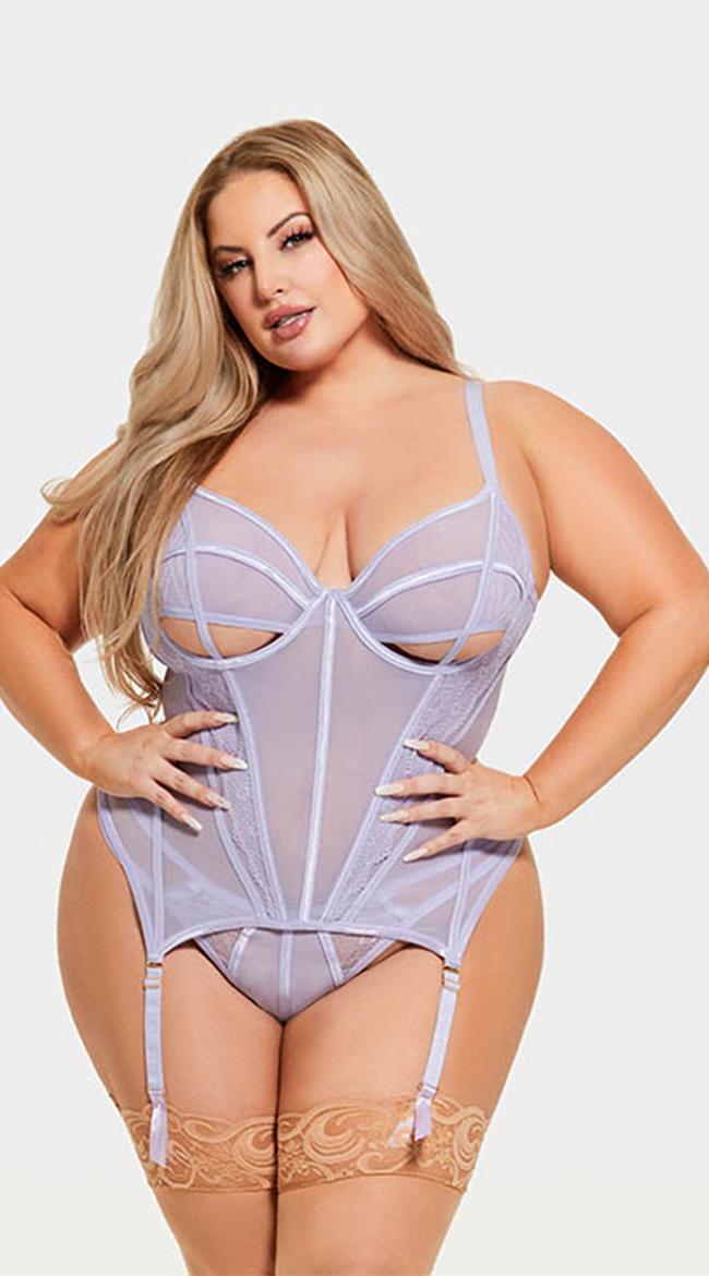Highlight your sexy curves in this plus size sexy bustier set featuring underwire cups with peekaboo open panels, piping details, adjustable spaghetti straps, built-in boning, a hook and eye back closure with a lace trim, adjustable garter straps, and a matching thong. (Thigh high stockings not included.)