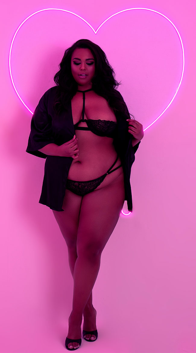Be your babe's insanely sexy turn on in this gorgeous plus size bra set featuring sheer lace underwire cups with a strappy, adjustable choker harness, a hook back of neck closure, a hook and eye back closure, and a matching lace panty with double hip straps, and a g-string cut back.