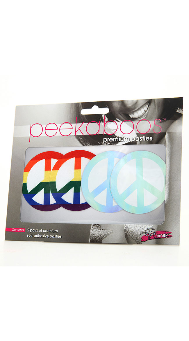 Share the love in this fun pasties pack featuring two pairs of premium self-adhesive pasties. Both sets feature a circular peace sign shape: One with a striped rainbow design, and the other a pastel tie dye design. Gently peel off and store away for multiple uses.