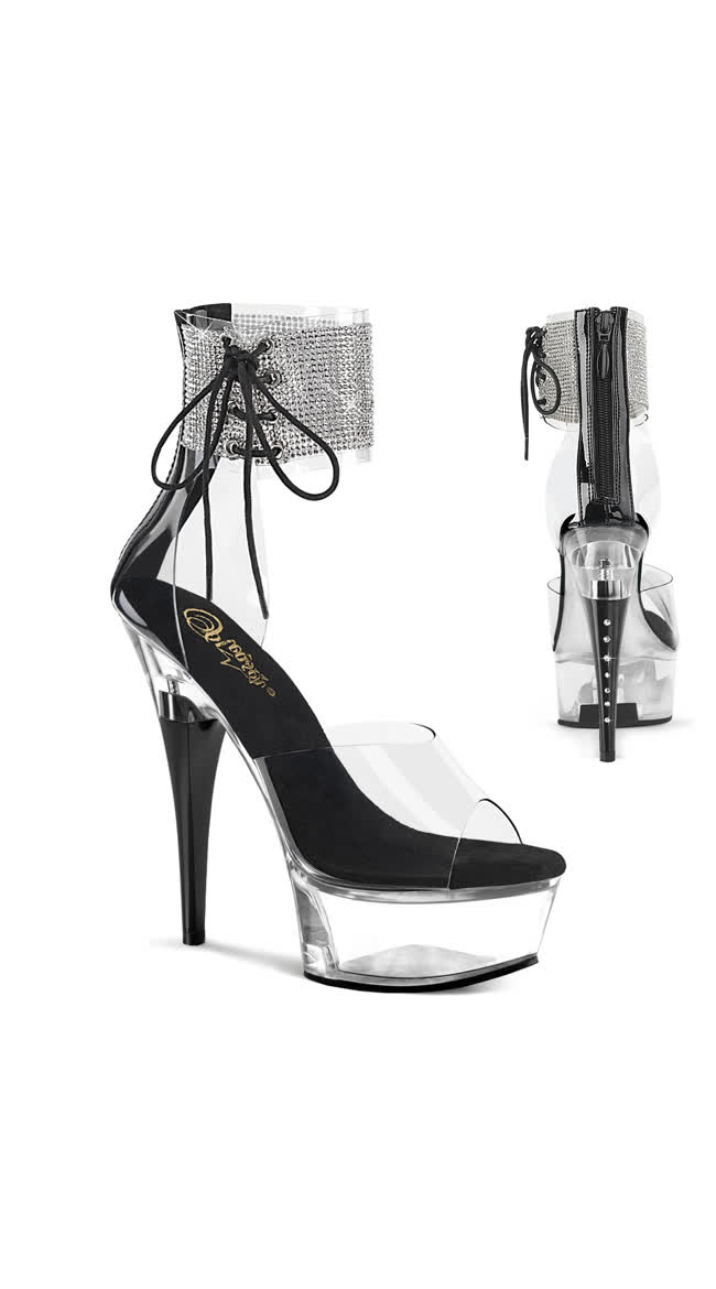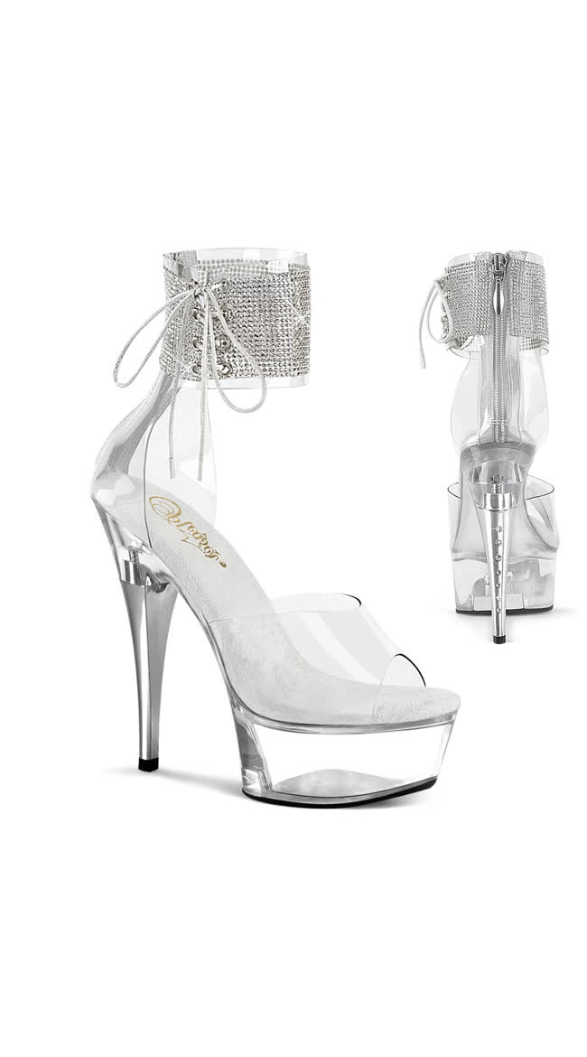 6" (152mm) Heel, 1 3/4" (44mm) Platform Close Back Rhinestone Embellished Ankle Cuff Sandal w/ Side Lacing Featuring Rhinestone on Back of Heel, Back Zip Closure