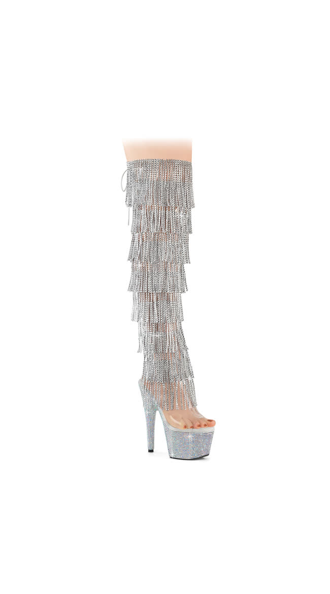 7" (178mm) Heel, 2 3/4" (70mm) Platform Open Toe/Heel Lace-Up Back Over-The-Knee Boot Featuring 8-Layer Simulated Rhinestone Fringes and Silver AB Rhinestones Encrusted All-Over the Entire Platform Bottom, Full Length Inner Side Zip Closure