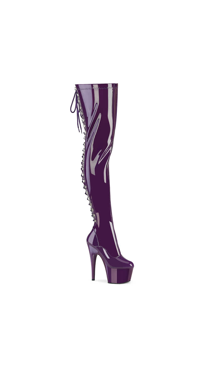 7" (178mm) Heel, 2 3/4" (70mm) Platform Lace-Up Back Stretch D-Ring Thigh High Boot, Full Length Inner Side Zip Closure