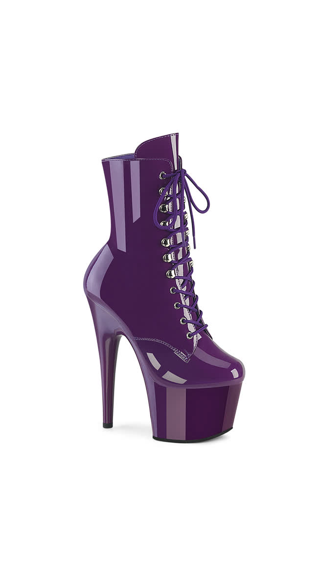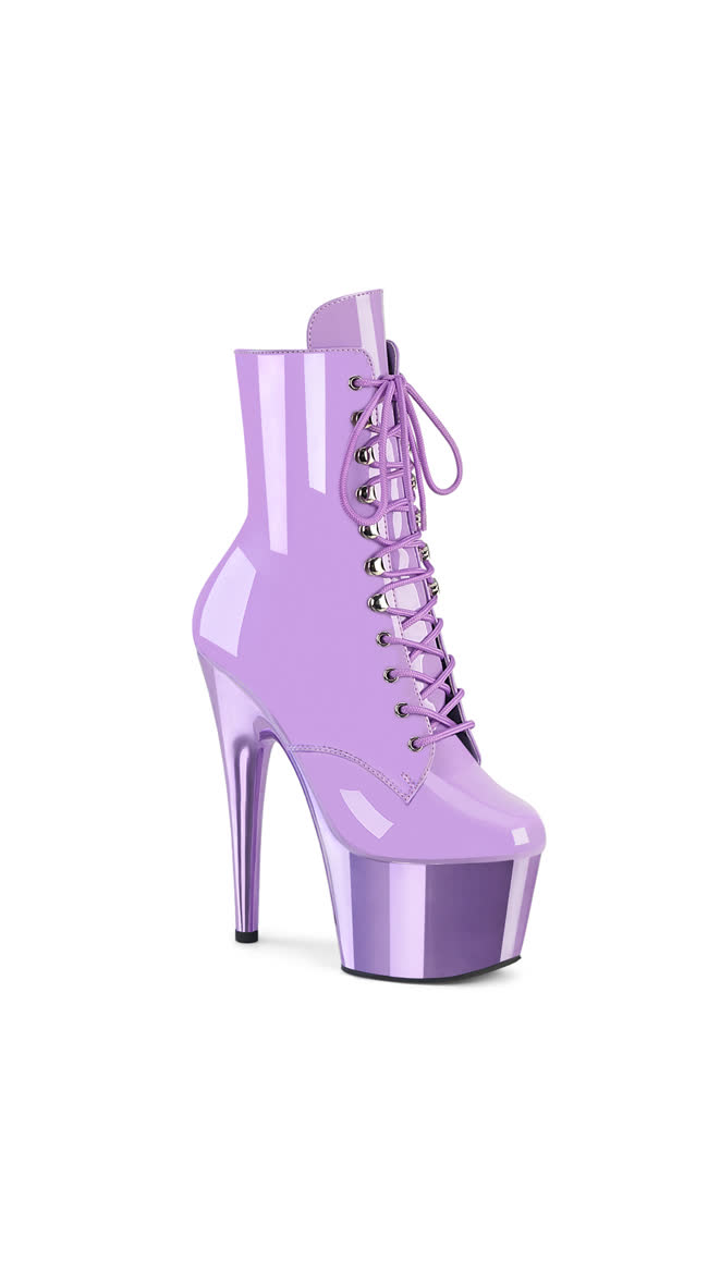 7" (178mm) Heel, 2 3/4" (70mm) Platform Lace-Up Front Ankle Boot Featuring Chrome Plated Platform Bottom, Inner Side Zip Closure