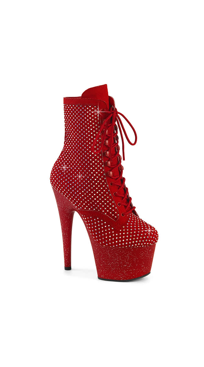7" (178mm) Heel, 2 3/4" (70mm) Platform Lace-Up Front Ankle Boot Featuring AB Rhinestone Mesh Overlay Upper and Mini Iridescent Glitters All Over the Entire Platform Bottom, Inner Side Zip Closure