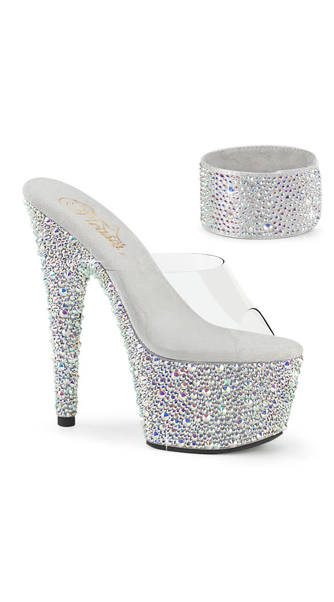 7" (178mm) Heel, 2 3/4" (70mm) Platform Slide Featuring Multi Sized Rhinestones Encrusted on the Entire Platform Bottom. Includes a Pair of 1 3/4" (45mm) Matching Adjustable Ankle Cuffs