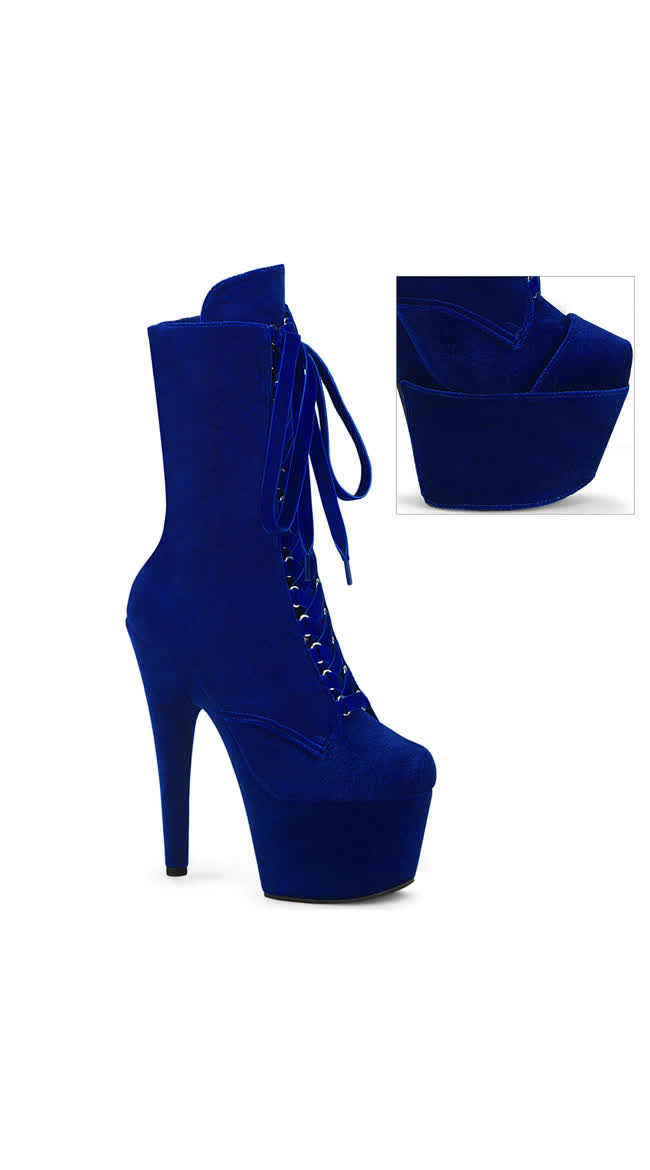 7" (178mm) Heel, 2 3/4" (70mm) Platform O-Ring Lace-Up Front Ankle Boot Featuring Fully Wrapped Platform Bottom, Inner Side Zip Closure. Includes a Pair of Matching Boot Protectors