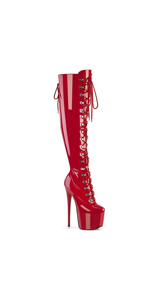 7" (178mm) Stiletto Heel, 3" (76mm) Concealed Platform Fully Lined Lace-Up Front Over-The-Knee Boot w/Speed Hooks & Back Slit Lace Detail, 1/3 Inner Side Zip Closure. Shaft Height: Approximately 19 Inches (48cm).
