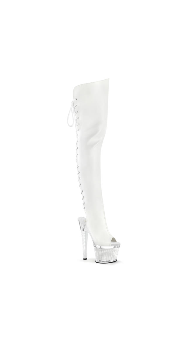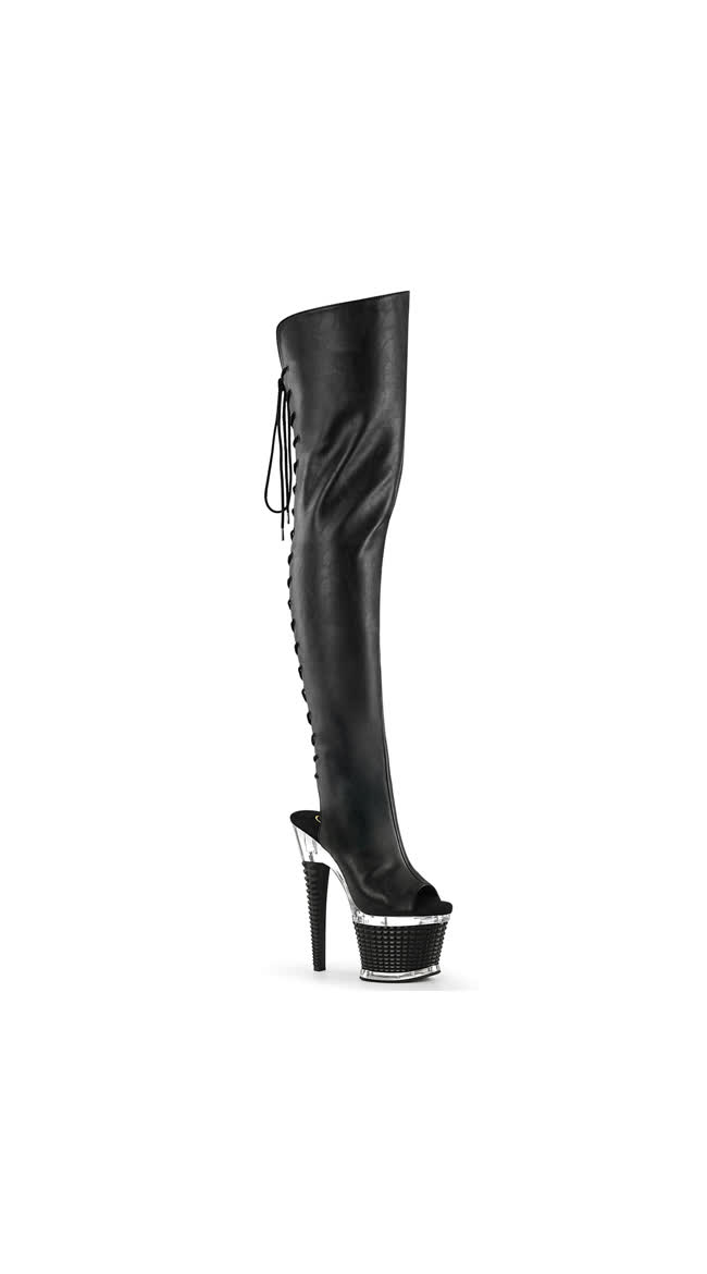 7" (178mm) Heel, 3" (76mm) Textured PF Open Toe/Heel Lace-Up Back Thigh High Boot, Full Length Inner Side Zip Closure