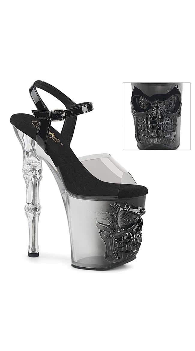 8" (200mm) Finger Bone Heel, 4" (100mm) Platform Ankle Strap Featuring Skull & Bones Clear/Black Ombre Platform Bottom