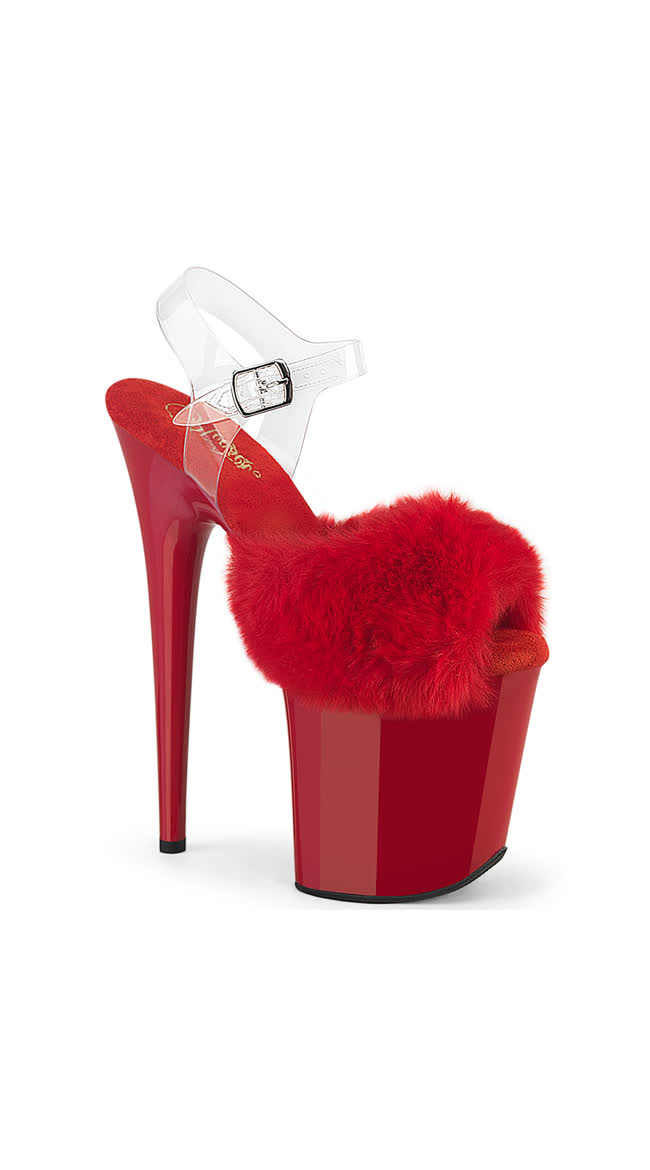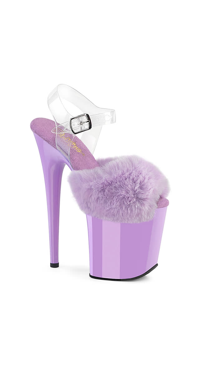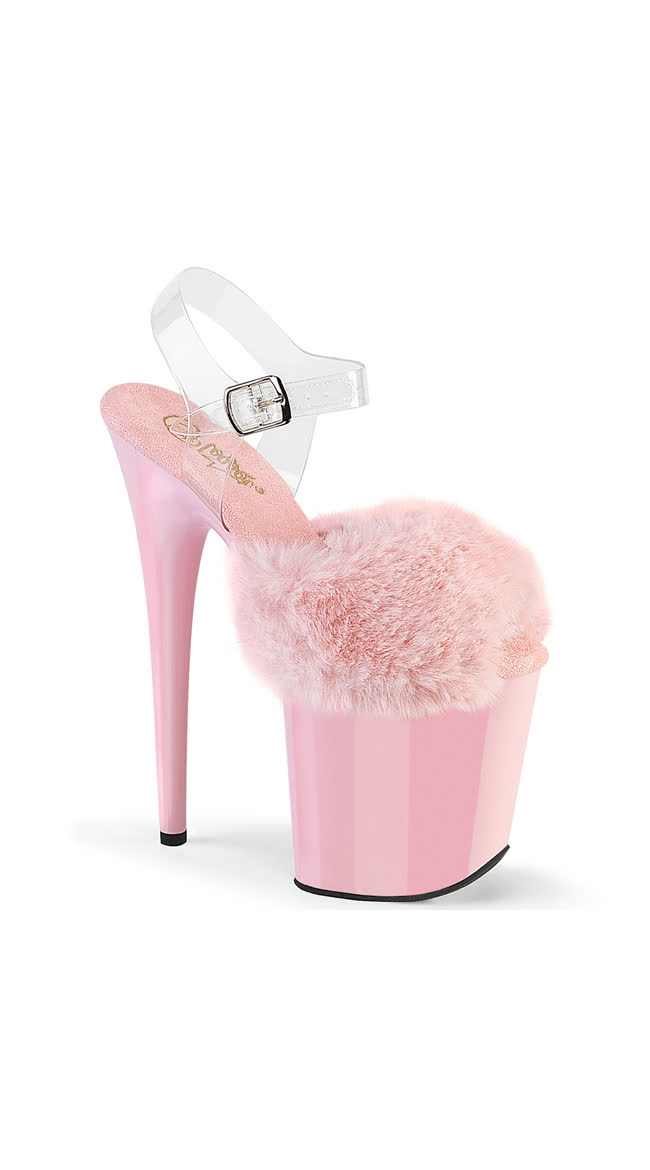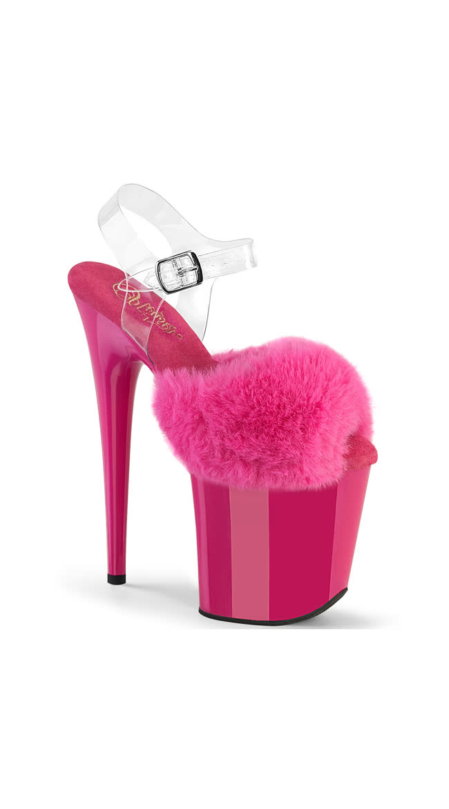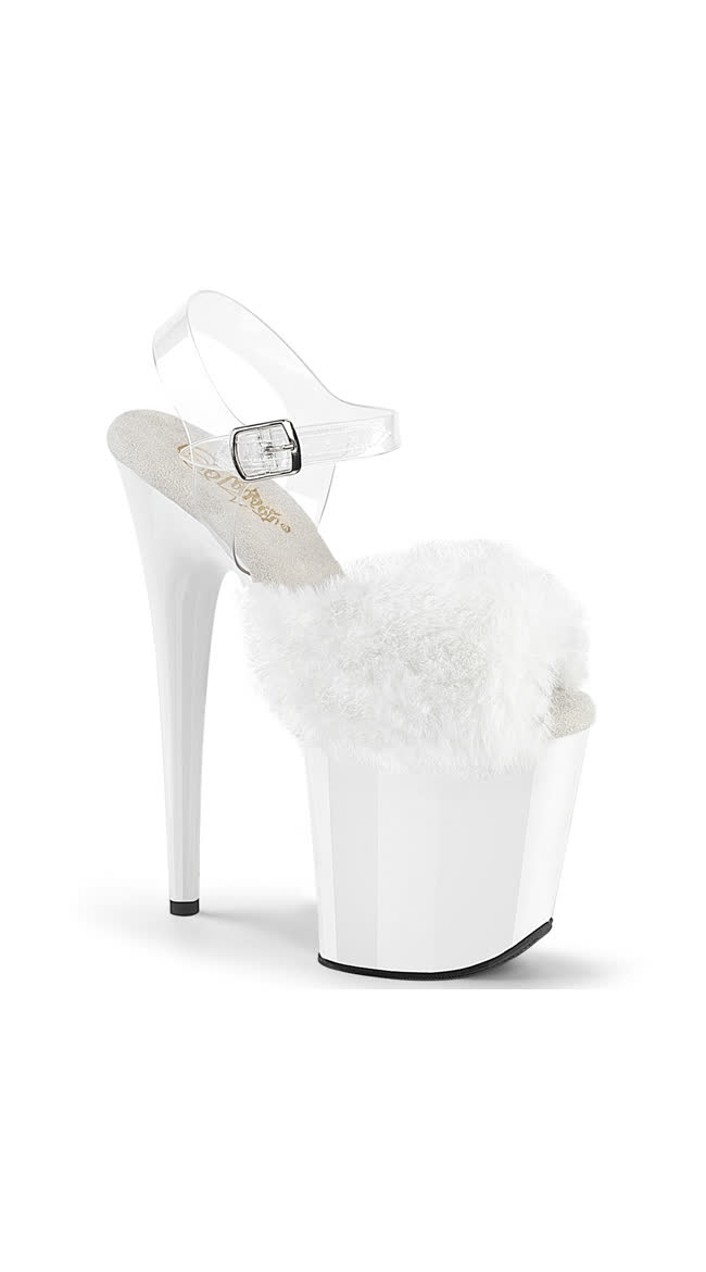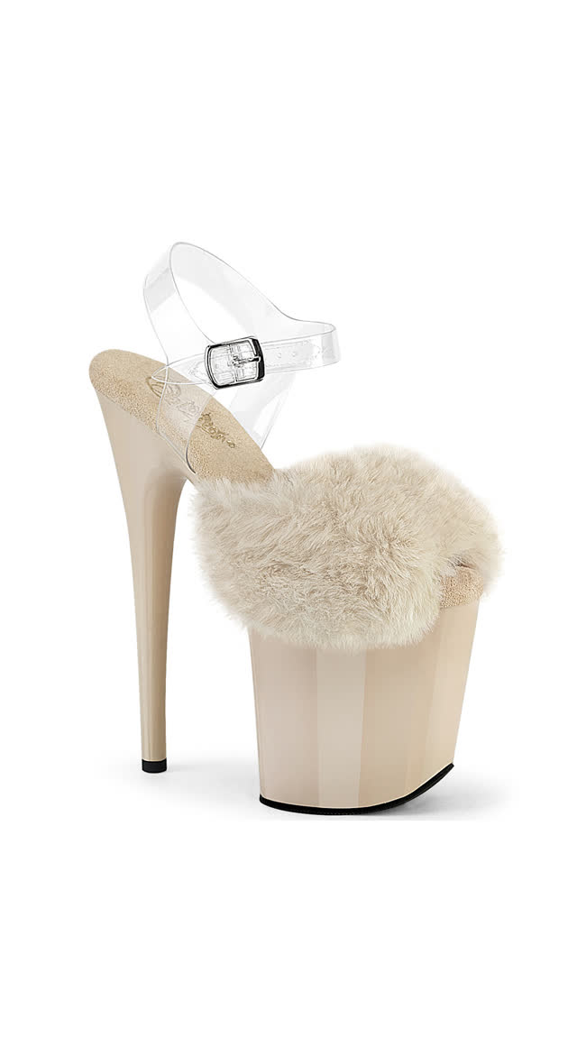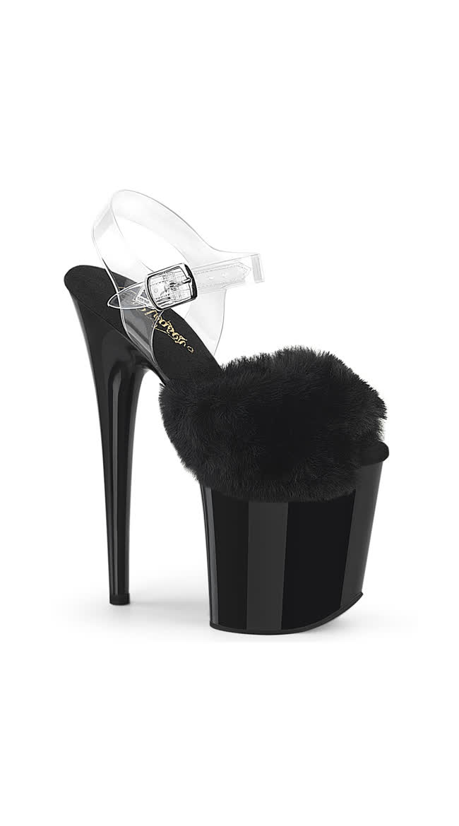 8" (200mm) Heel, 4" (100mm) Platform Peep Toe Fluffy Faux Fur Ankle Strap Sandal Featuring Clear Soft TPU Ankle Strap