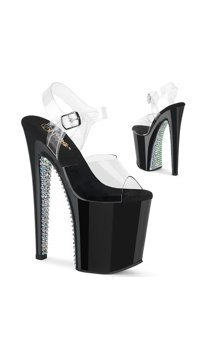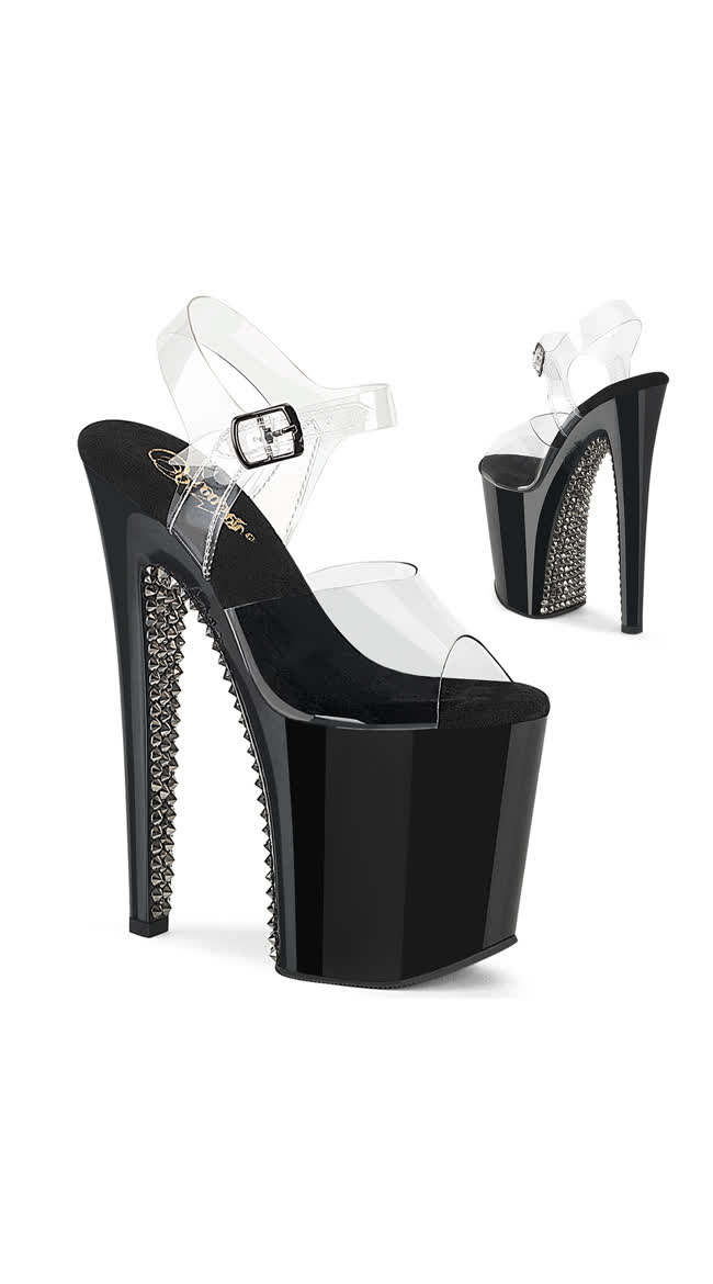 8" (200mm) Heel, 4" (100mm) Platform Ankle Strap Sandal w/ Spiked Rhinestones on the Platform Underside & Front of the Heel