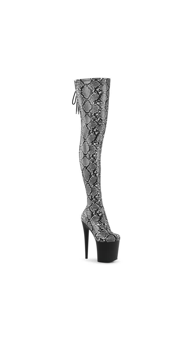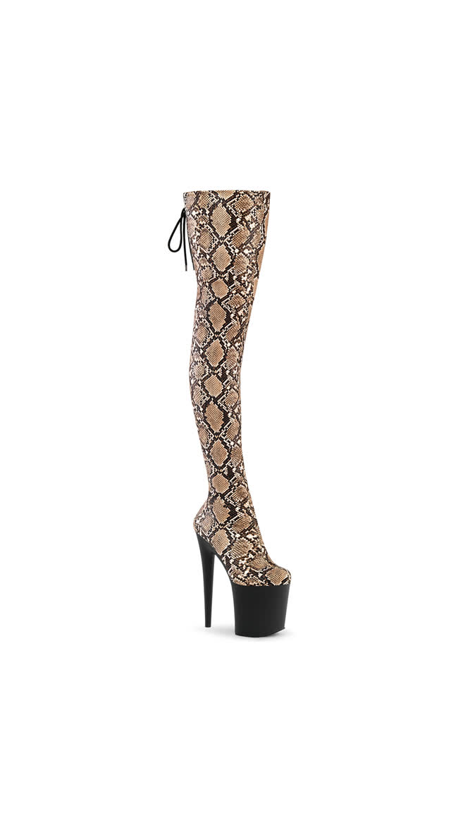 8" (200mm) Heel, 4" (100mm) Platform Platform Stretch Snake Print Pull-On Thigh Boot w/Rear Tie Fastening