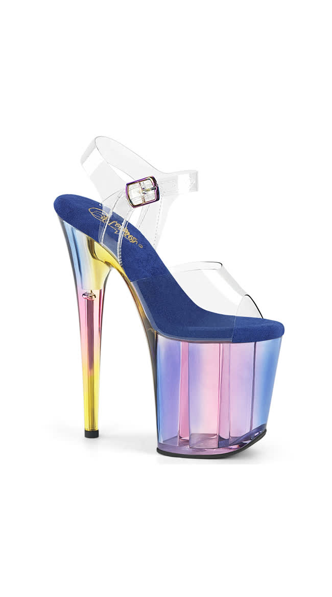 8" (200mm) Heel, 4" (100mm) Platform Ankle Strap Sandal Featuring Holographic Tinted Platform Bottom