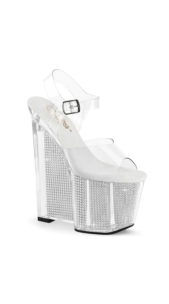 8" (200mm) Wedge Heel, 3 1/2" (90mm) platform Ankle Strap Sandal Featuring Simulated Rhinestone Filled Platform Bottom
