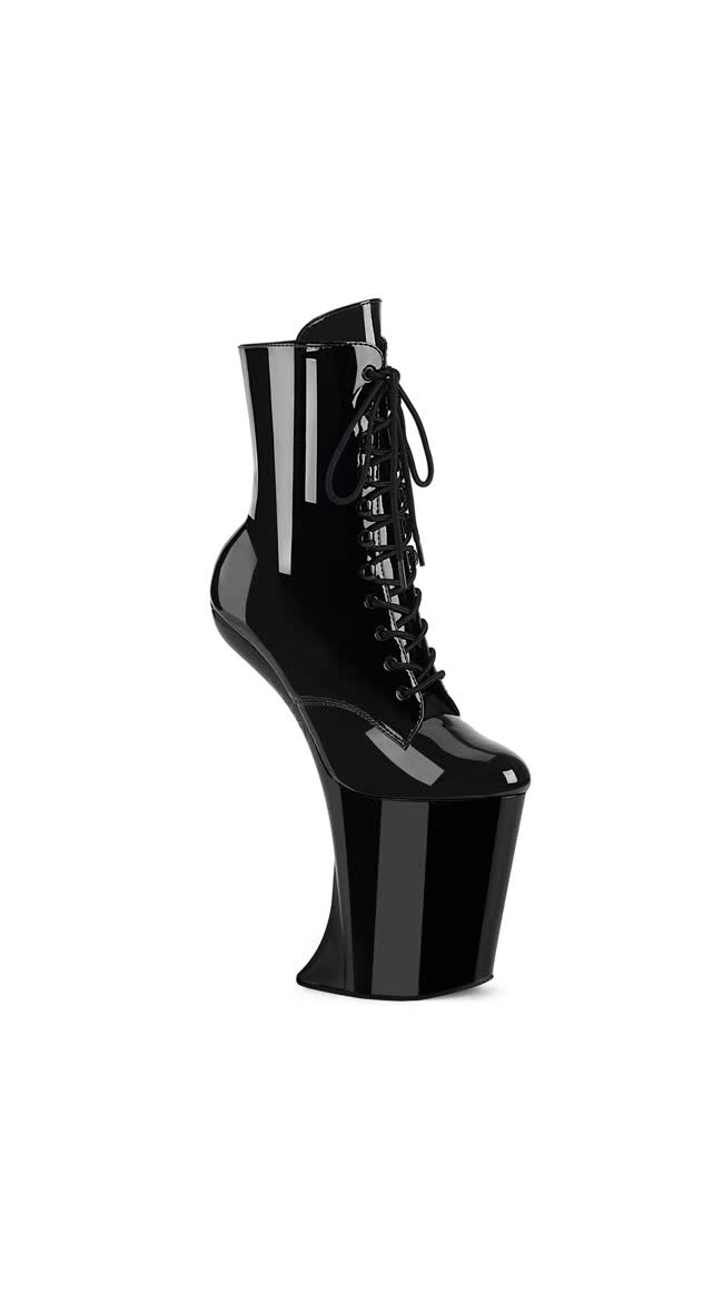 9" (229mm) Heelless, 4" (100mm) Platform Lace-Up Front Ankle Boot, Inner Side Zip Closure. **WARNING: Extreme Height & Heelless Design. Not Recommended for Walking or Dancing.