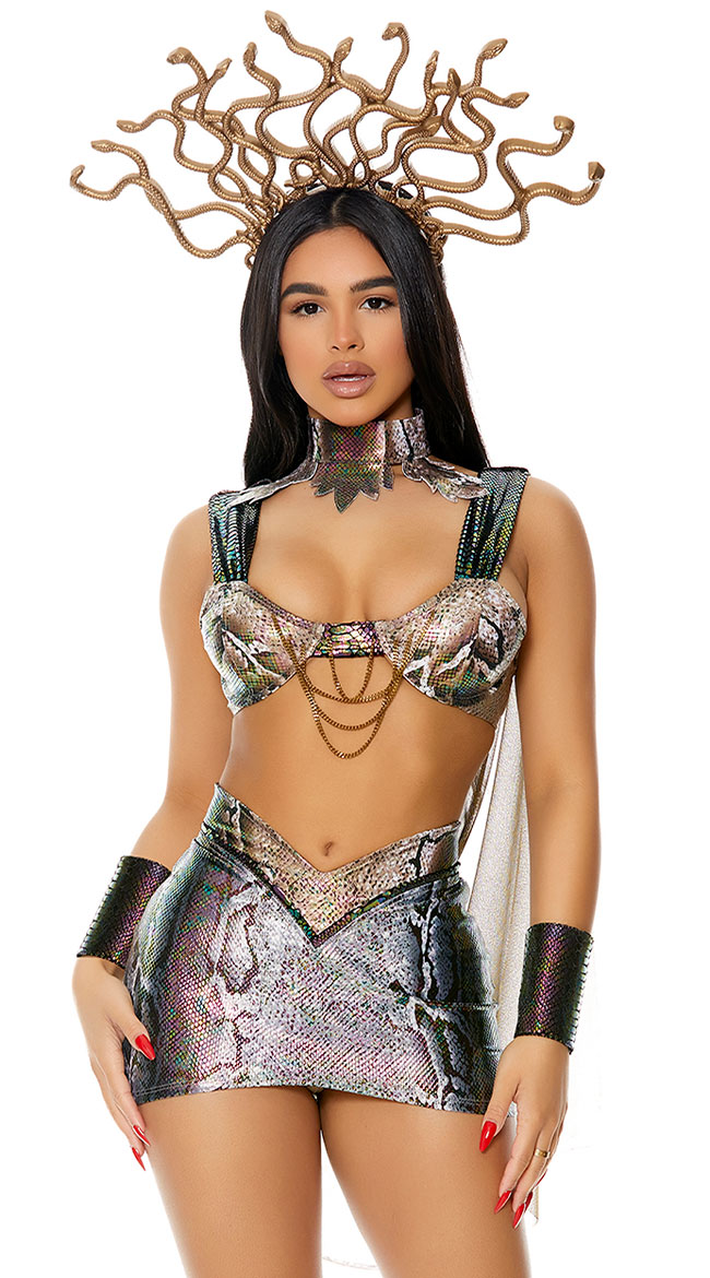 Embrace your inner goddess! Make the whole room jealous in this A Head In The Game costume featuring a metallic reptile print underwire bra with a draping chain detail and attached back drapes, a mini skirt, and a matching choker and cuffs. (Headpiece and shoes not included.)