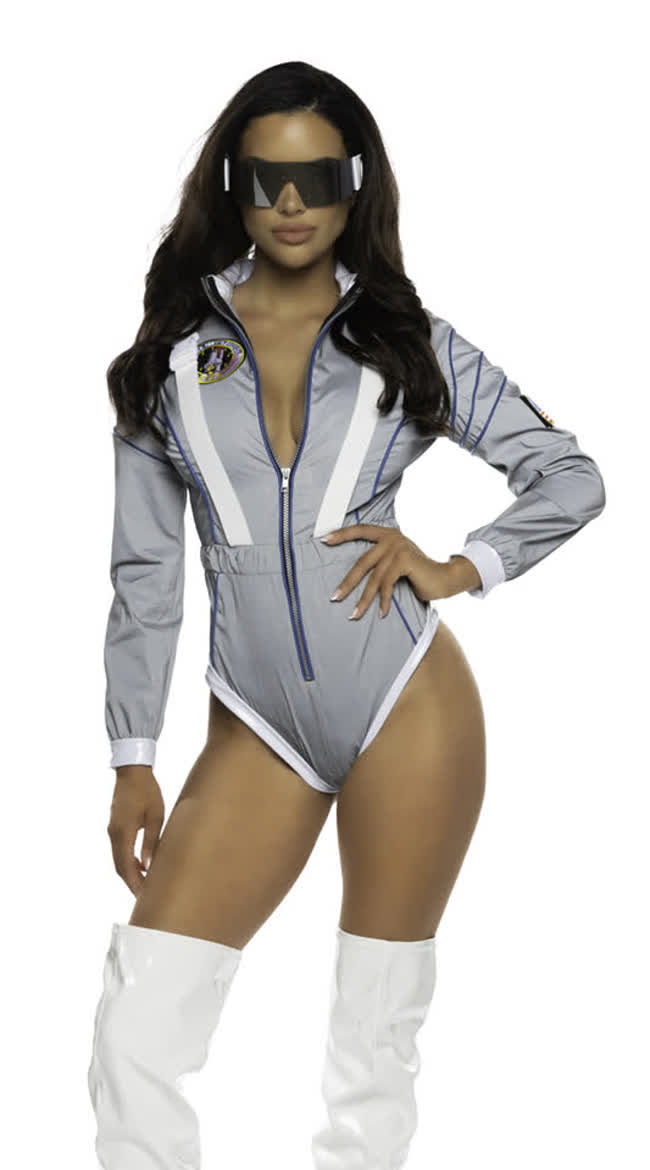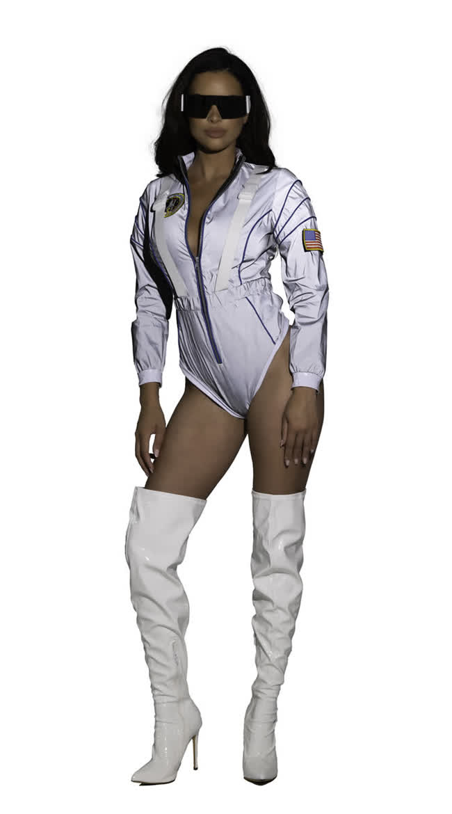 Take your look out of this world in the Alluring Astronaut Costume featuring a metallic silver zip-front bodysuit with NASA-inspired patches and bold shoulder accents. Sleek, sexy, and ready for launch, this intergalactic style will have you ruling the galaxy this Halloween.