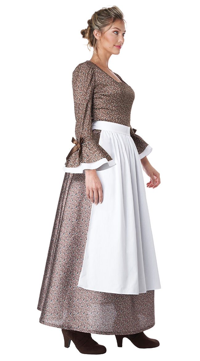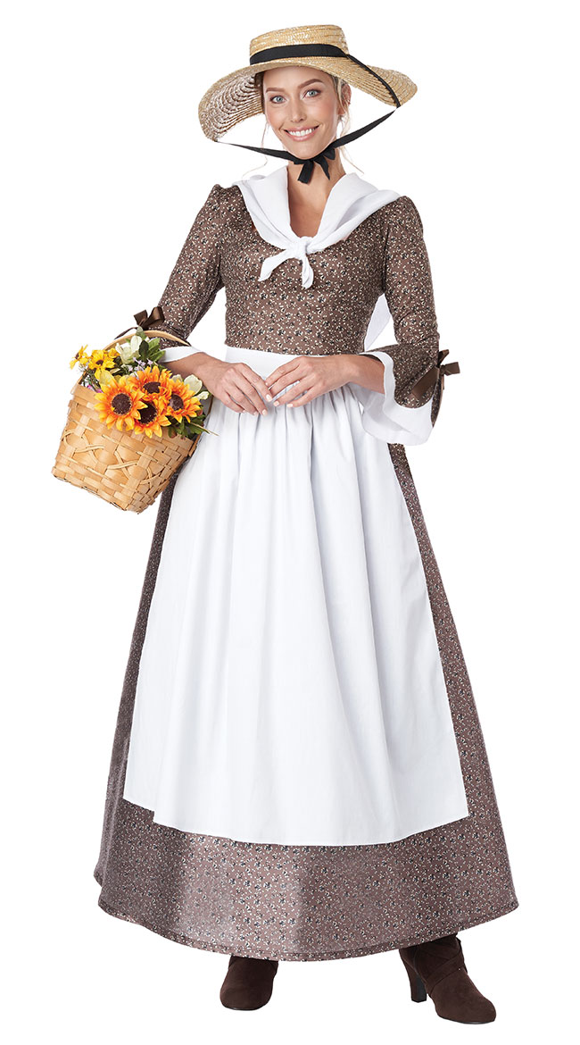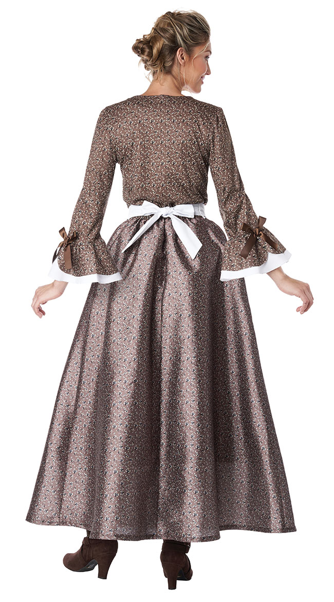 Step back in time and make history in this Back In The Day Baddie Costume featuring a long brown dress with a floral print, a square neckline, 3/4 sleeves with a bow accent, a removable white shawl, and a white apron. (Hat, basket, and boots not included.)