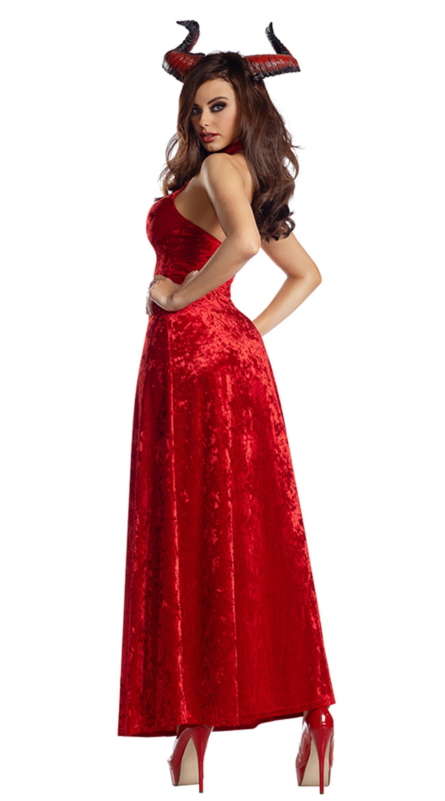 You love dancing with the devil! Make them worship you in this Bad Religion costume featuring a red velvet mock neck dress with a sheer upside down cross detail and a sky-high slit, a built-in panty, and a matching horns headpiece. (Staff and shoes not included.)