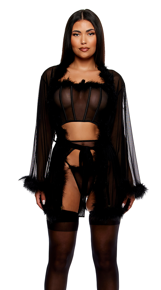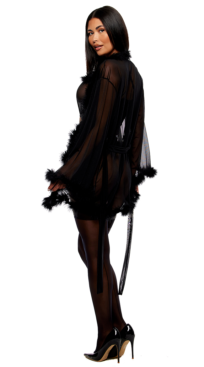• Sheer mesh robe with marabou contrast trim detail.
