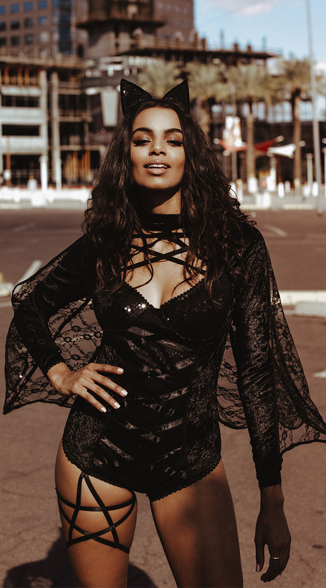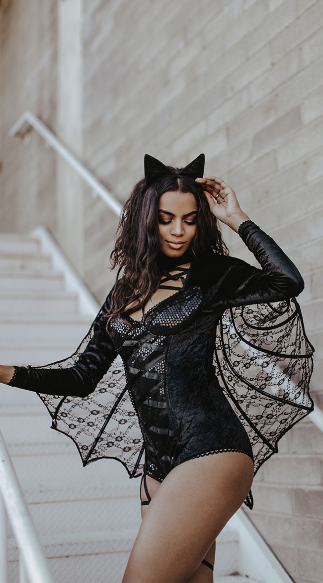 Go out and play in this dark Bat Honey costume featuring a long sleeve crushed velvet romper with pentagram details, an attached lace bat 'cape', a sweetheart neckline with padded cups, a center panel with sequin accents, a faux lace-up bodice, a pentagram garter detail, a cheeky cut back, a back keyhole opening, and a matching bat ear headpiece.