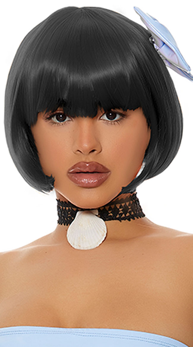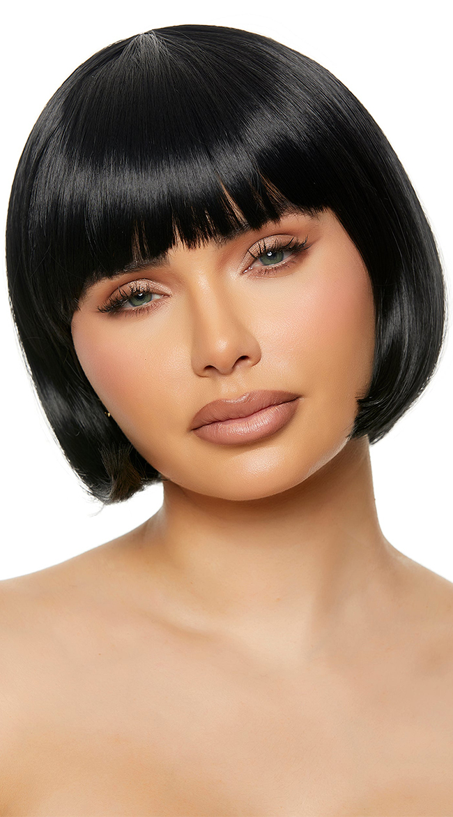 • Short bob style with blunt cut bangs and curled edges