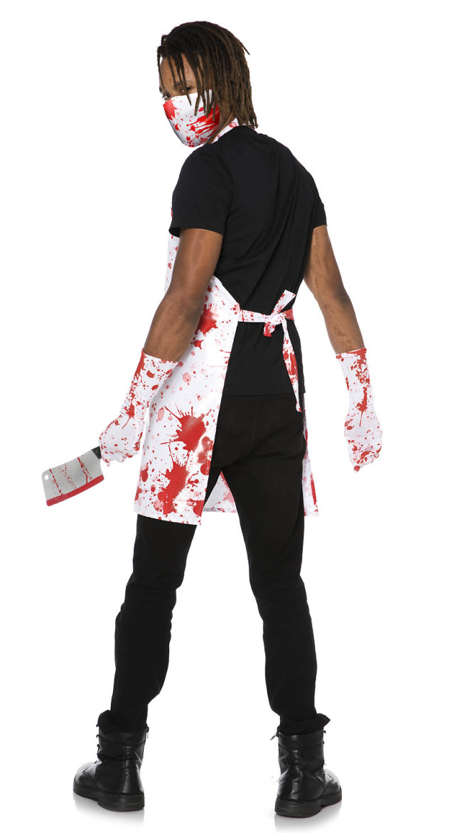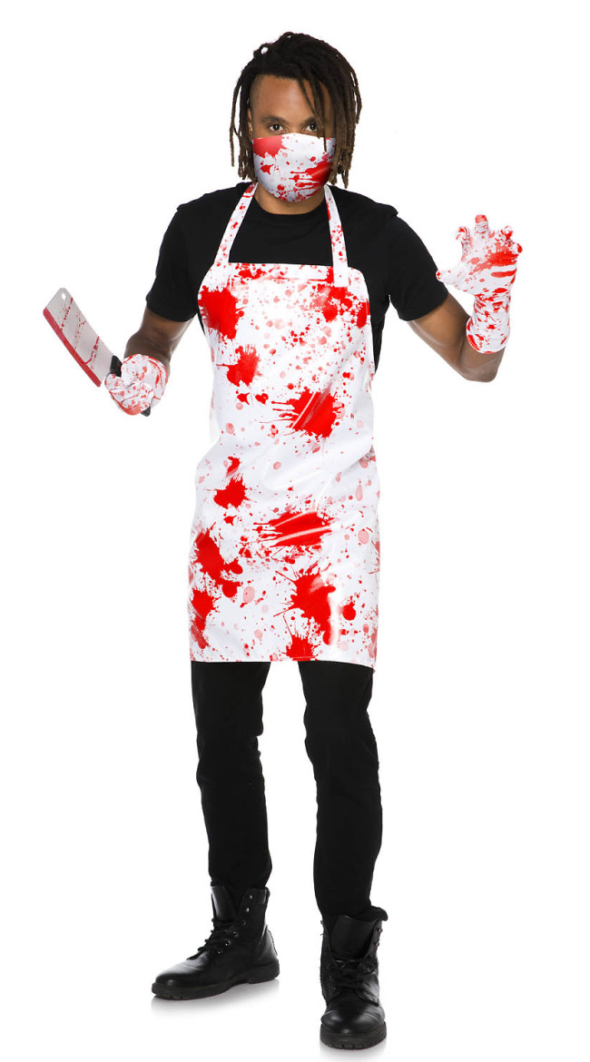 Serve up some scares in the Men's Bloody Butcher Costume. This chilling look includes a blood-splattered apron, matching gloves, and a face mask for a truly gruesome appearance. Perfect for a terrifying Halloween night. (Pants not included.)