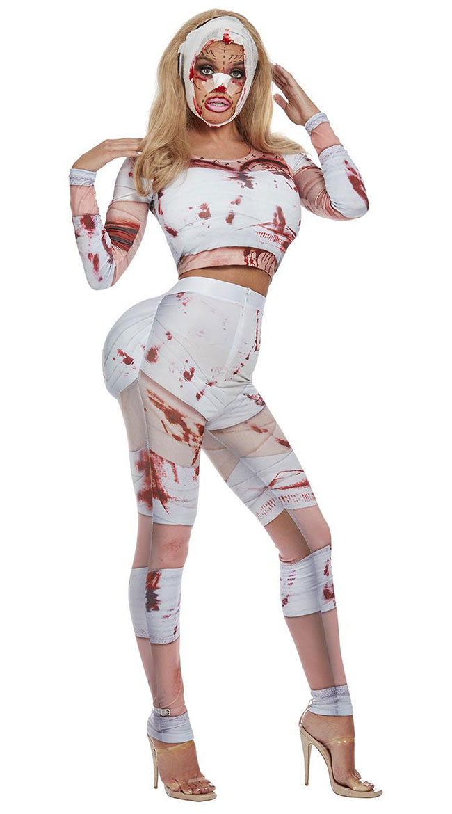 Oops! Get that boob job for half the rate? Some would say flaws are beautiful, but these post-surgery scars sure aren't. Own your new look in this Botched Babe costume featuring a white bandage padded long sleeve crop top with blood marks, and matching high waisted leggings with butt padding. (Facial bandage, makeup and shoes not included.)