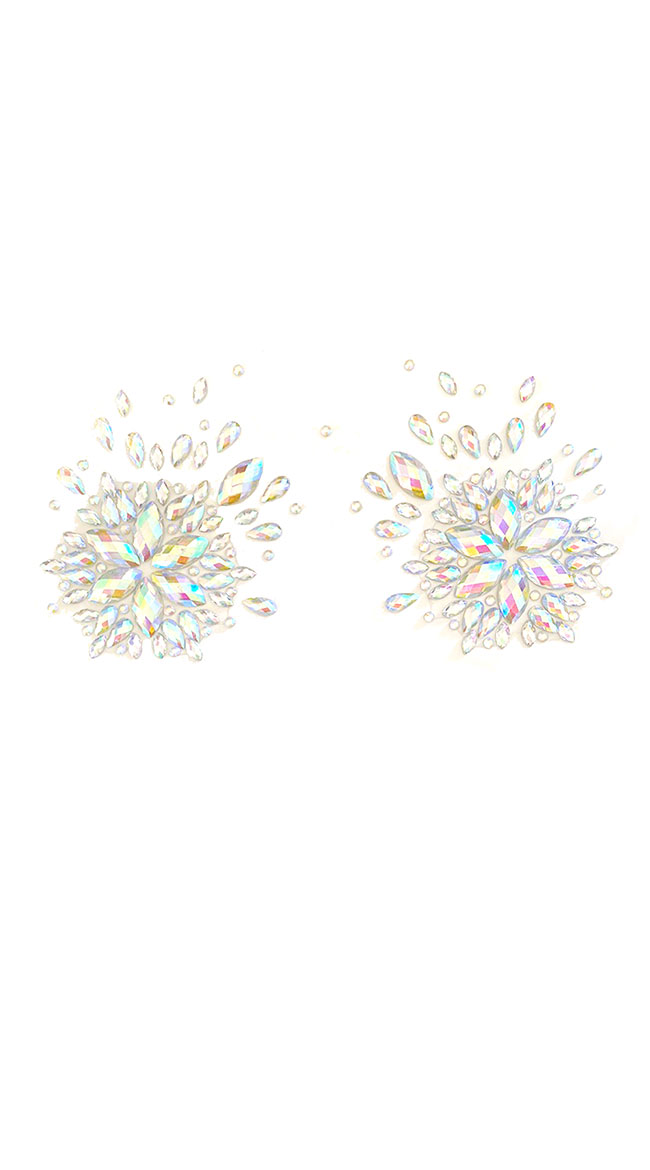 Sparkle your way to the party in these fun jewel pasties featuring iridescent teardrop jewels in a floral shape, and a clear adhesive backing that can be peeled off and stored away for future use.