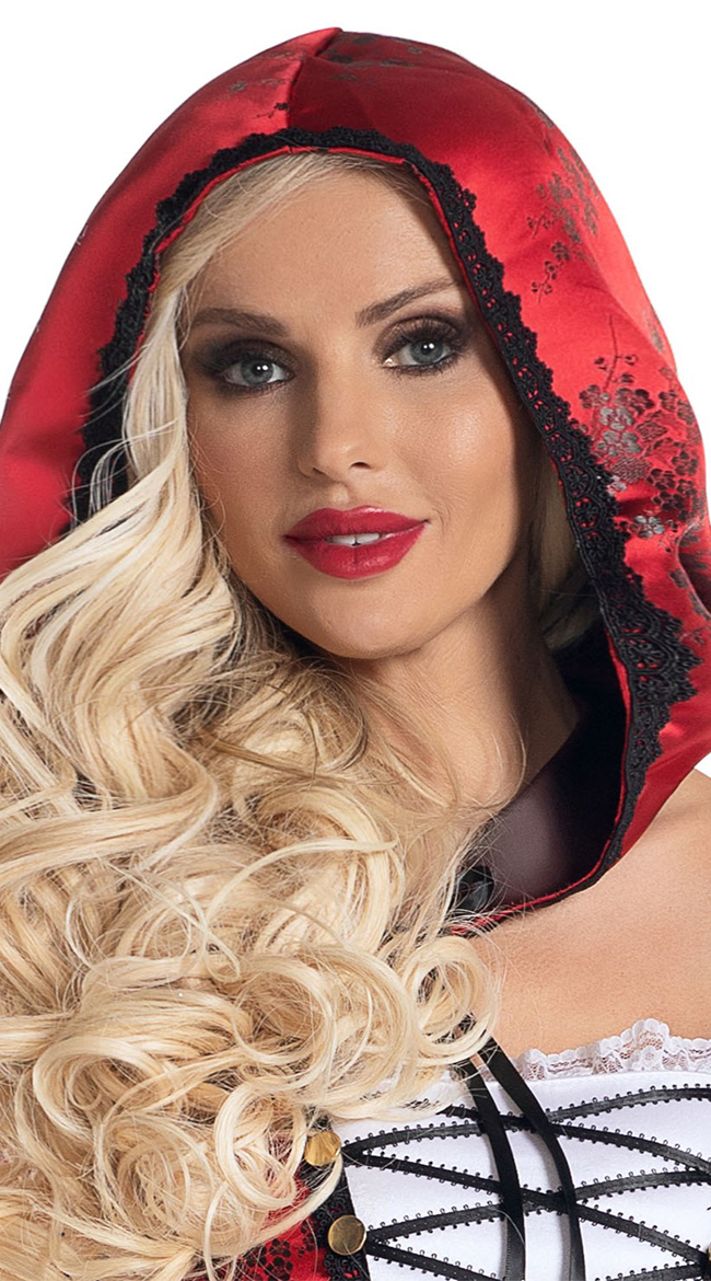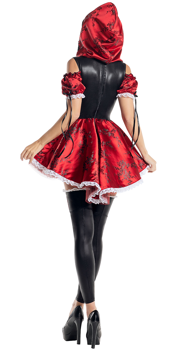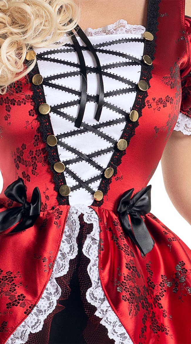 • Brocade skirt, puff sleeves, satin ribbon and gold button details