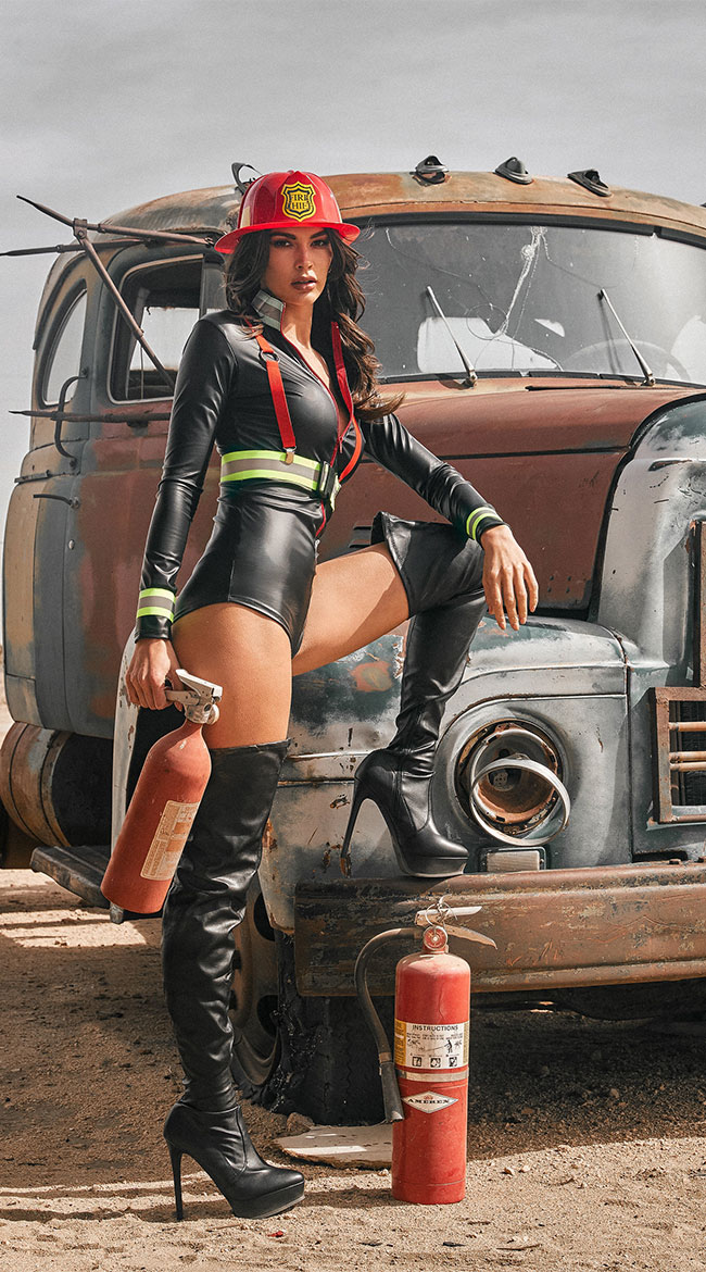 It's getting hot in here. Raise the temps in this Burnin' Down The House costume featuring a long sleeved zip-up wet look romper, an O-ring harness with reflective accents, and a firefighter hat. (Boots not included.)