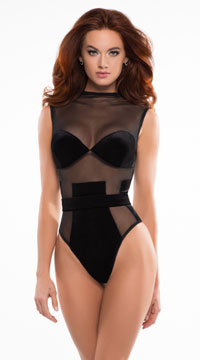 Step out in retro 1960's glam in this ultra-flattering bodysuit featuring an all over sheer mesh with a modest high neckline, a sleeveless style, opaque velvet cups and geometric bodice panels, ultra high cut sides, a full back zipper, and a mesh cheeky cut back. Wear as a sensual lingerie look or a fab nighttime style with skinny jeans.