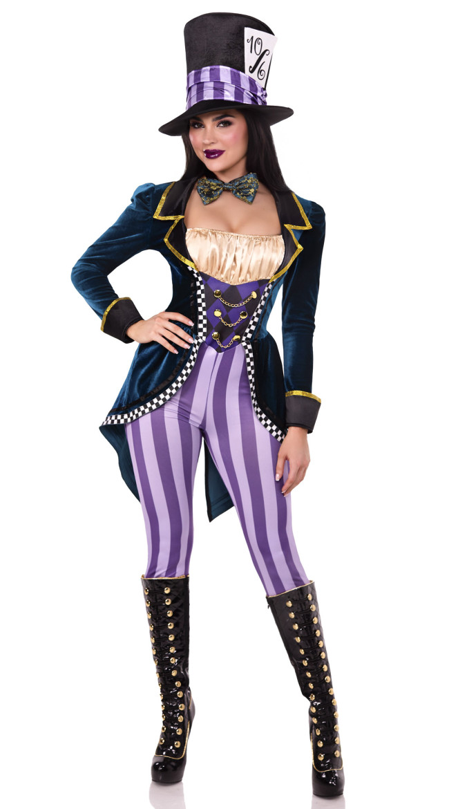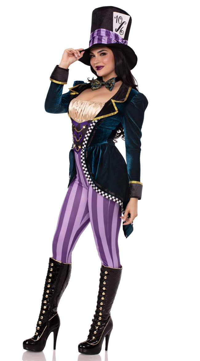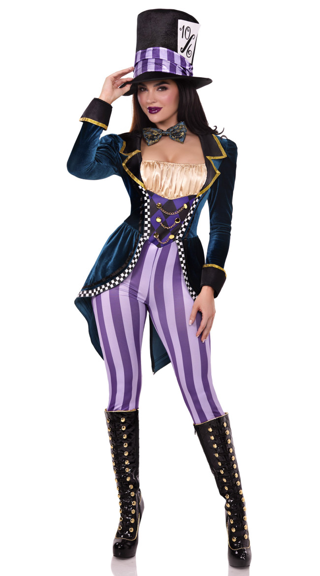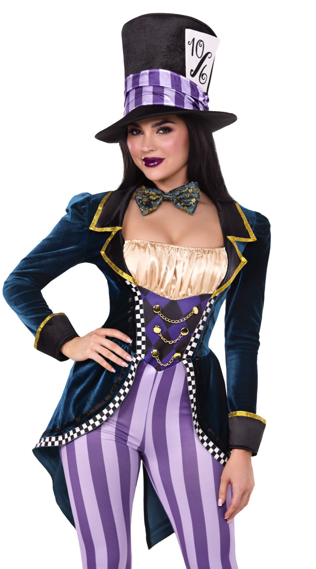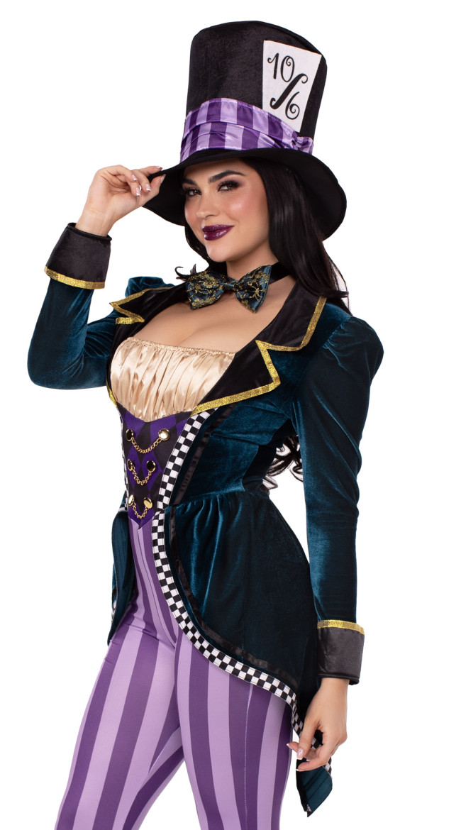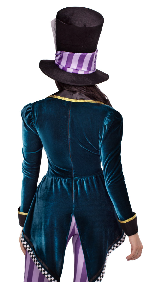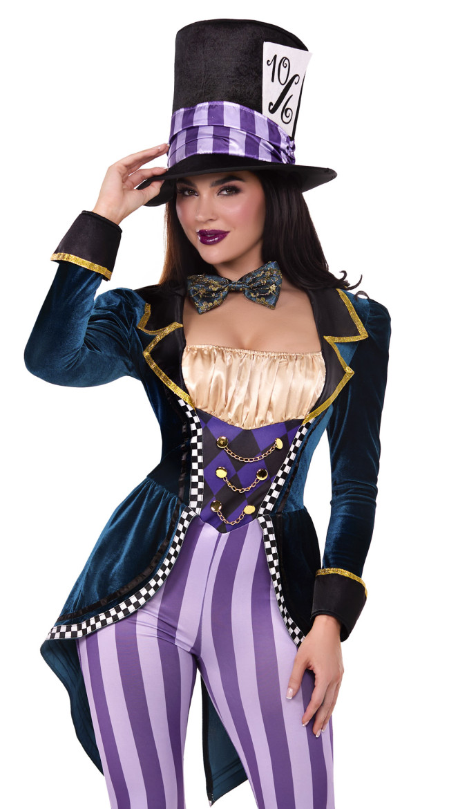 Go mad in this Classic Mad Hatter Costume and let your playful side shine! The rich teal velvet jacket with bold yellow trim and checkered detailing perfectly contrasts with the purple and white striped leggings. Complete the look with a fun oversized bow tie and a signature top hat adorned with a quirky “10/6” tag. (Shoes sold separately.)