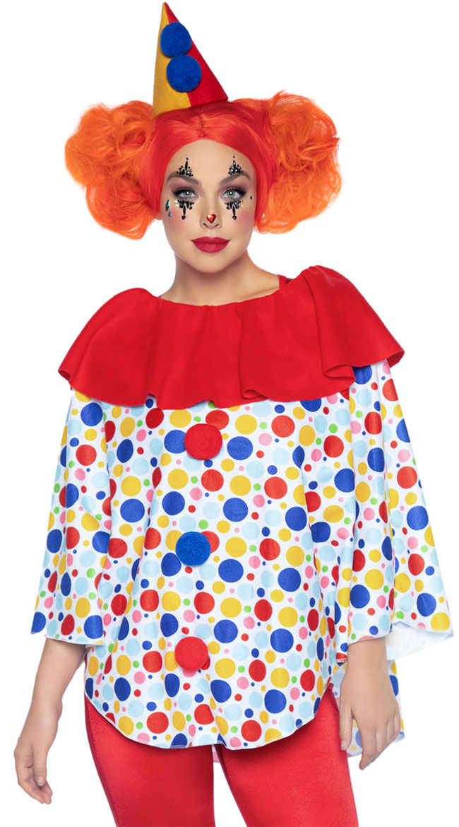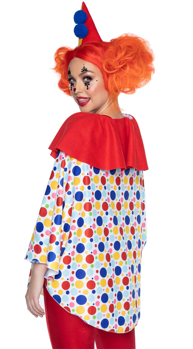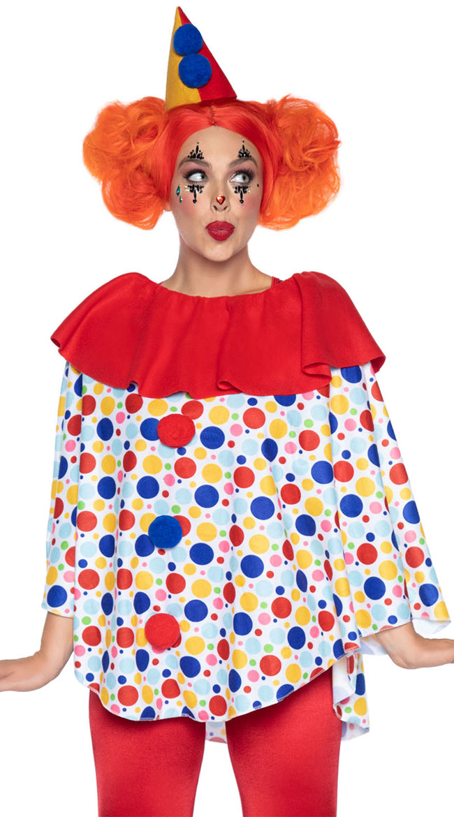 Perfect your juggling act in this Clownin Around costume featuring a multi-color dotted clown poncho with pom pom accents, a red ruffled collar, and a cute clown hat. (Face jewels and pants not included.)
