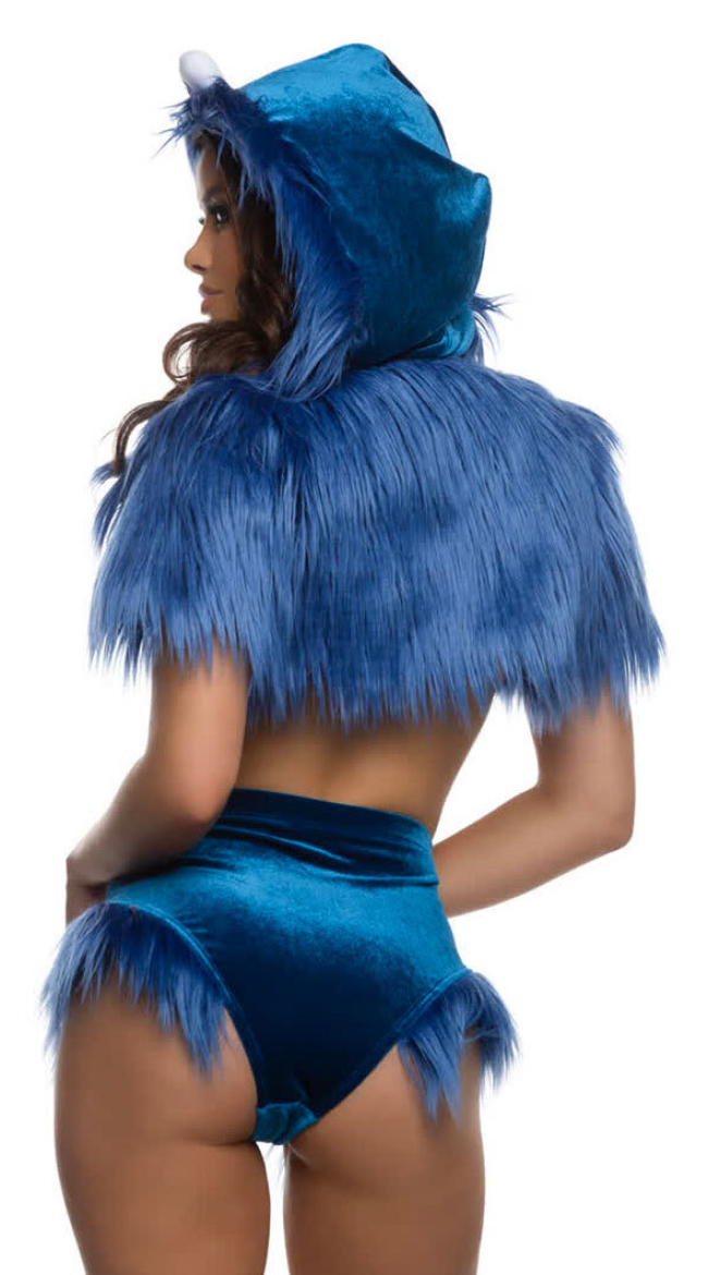 Indulge your cravings in the Cookie Jar Monster Costume, a playful set featuring a cookie-print bra top, fuzzy blue high-waist shorts, and matching faux fur shrug. With a goofy monster hood and wristlet, this flirty look is a sweet treat for any Halloween bash.