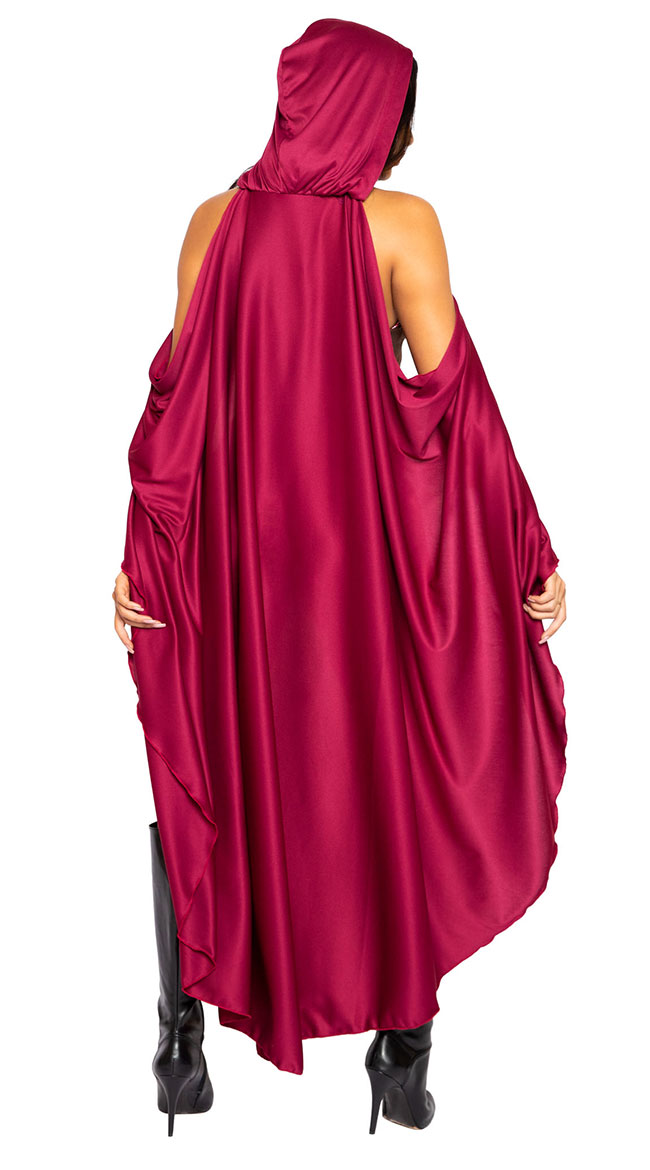 My, what big teeth you have! To grandmother's house you go in this Crimson Wolf Hunter costume featuring a red and white gingham print bodysuit with a ruffled, strapless neckline, a loose, off-the shoulder cape with sexy hood, attached brown harness with metal O-ring accents, and wraparound leg garters. (Basket and boots not included.)