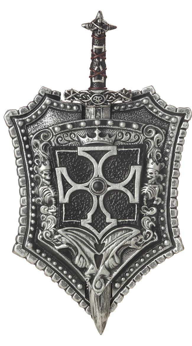 Protect yourself with this toy shield featuring skeleton details, a cross accent, crown detailing, a ribbed trim, a sword indent, and a matching sword with a brown lace-up handle.