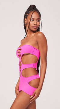 Very cute/sexy, but there's NO WAY you can even bend over in this thing without your girls coming out and this dress sliding down. My girls aren't that small, but not very chesty either. I will have to sew on something to go around my neck or over my shoulders for this to even be worn on a sexy date night. I'm only 5'4 130lbs. If I were to stretch it out in hopes for a "better fit", I think it would unravel. Some of the edges of the fabric are very weak looking.