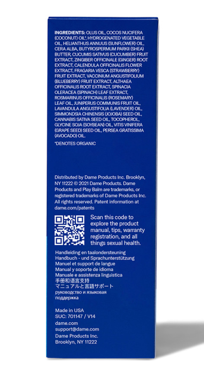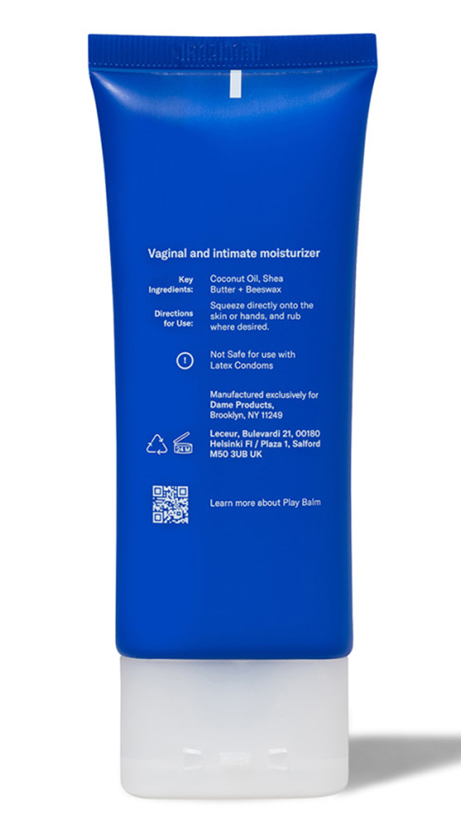 Play Balm is an oil-based intimate moisturizer made from a blend of coconut oil, shea butter, and beeswax. Safe for internal and external use, its formulation targets vaginal dryness and its lotion-y texture is ideal for all types of adult massage and play.Squeeze directly onto the skin or hands, and rub where desired.*Do not use with latex condoms.