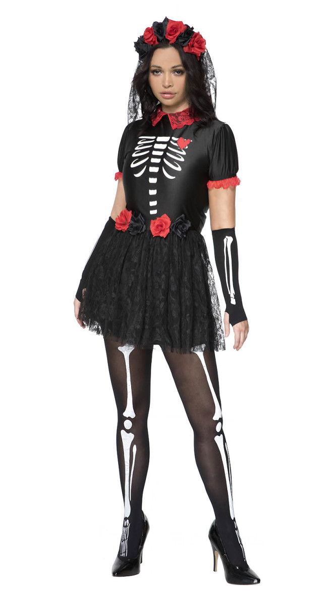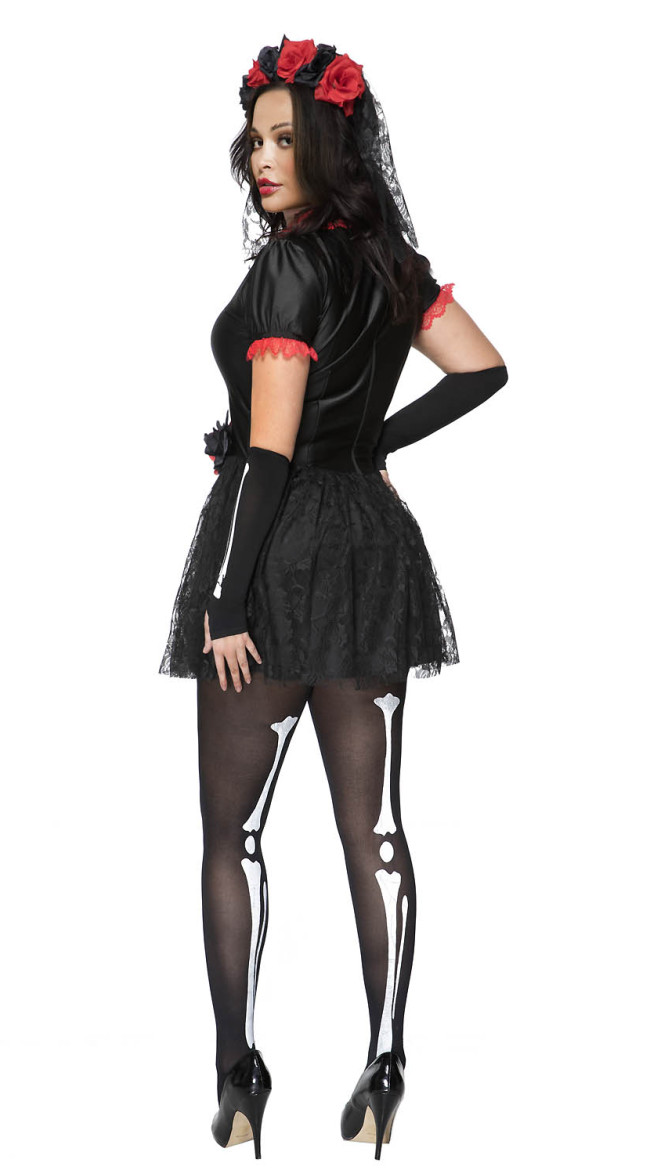 Celebrate in style with the Day Of The Dead Costume, a vibrant and festive look that honors the tradition. This costume features a black skeleton-print dress with lace skirt detail, red rose accents at the waist and neckline, and a matching rose headpiece with attached veil. Perfect for Halloween parties, festivals, or themed events.